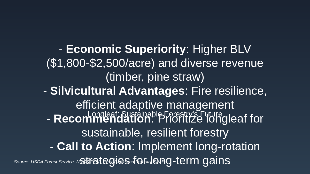 Summarize key insights: Economic advantages include higher bare land value (BLV) of $1,800-$2,500/acre for longleaf vs. $1,200-$1,800 for loblolly, plus annual pine straw revenue ($200-$400/acre). Silvicultural benefits feature superior fire resilience (95% seedling survival post-burn), pest resistance, and management efficiency via prescribed burns every 2-3 years. Recommend longleaf pine for sustainable forestry to balance ecology and profitability. Closing message: 'Longleaf: Sustainable Forestry's Future.' Call to action: Adopt long-rotation strategies (80-100 years) for resilient, high-yield forests. Include BLV comparison chart and longleaf timeline diagram on slide.