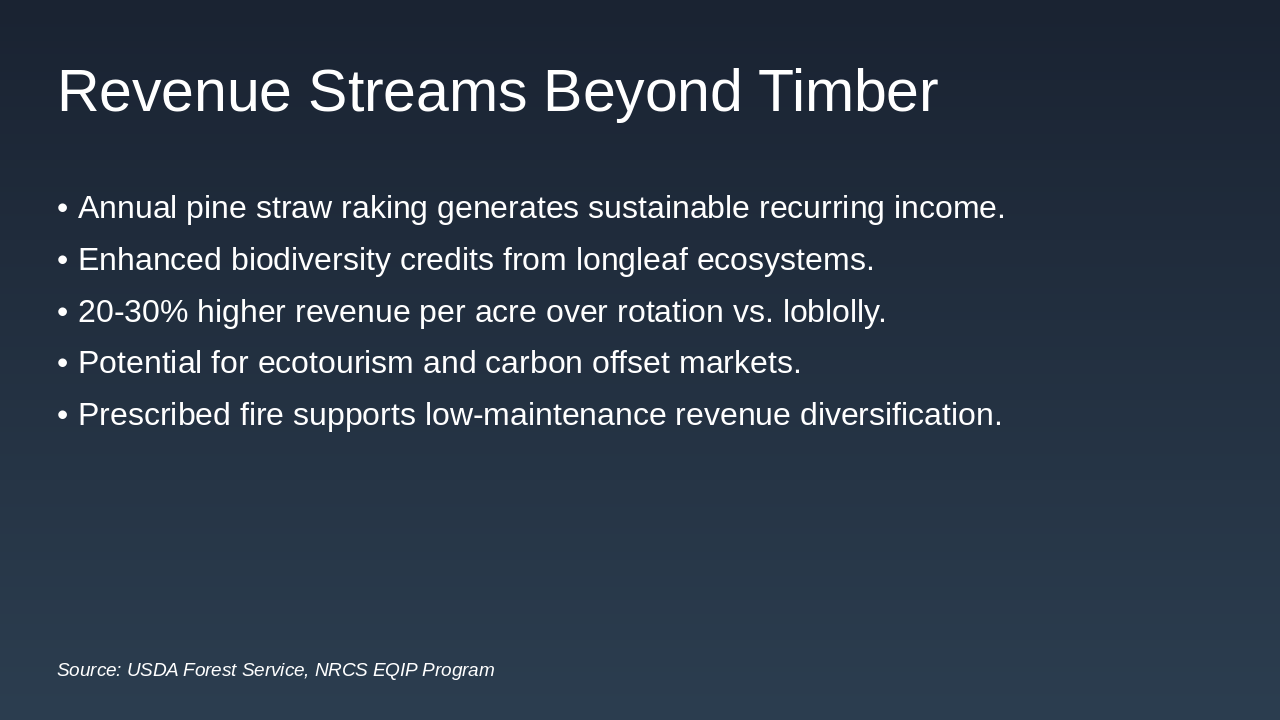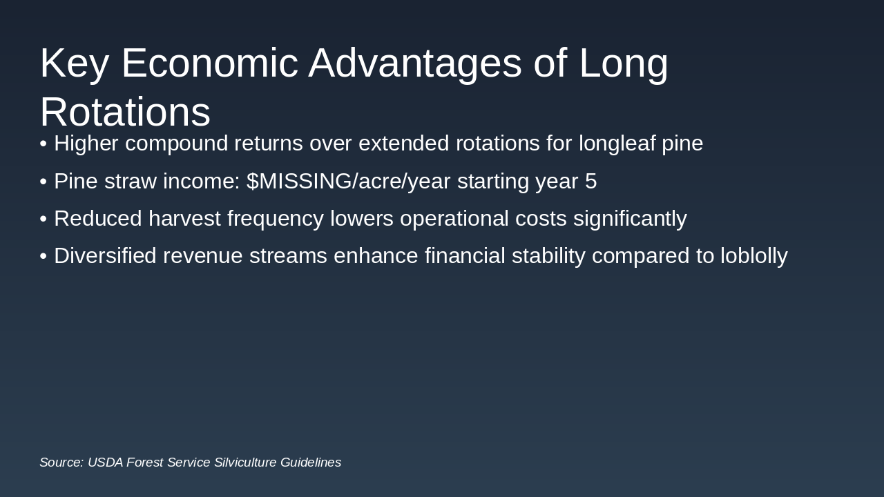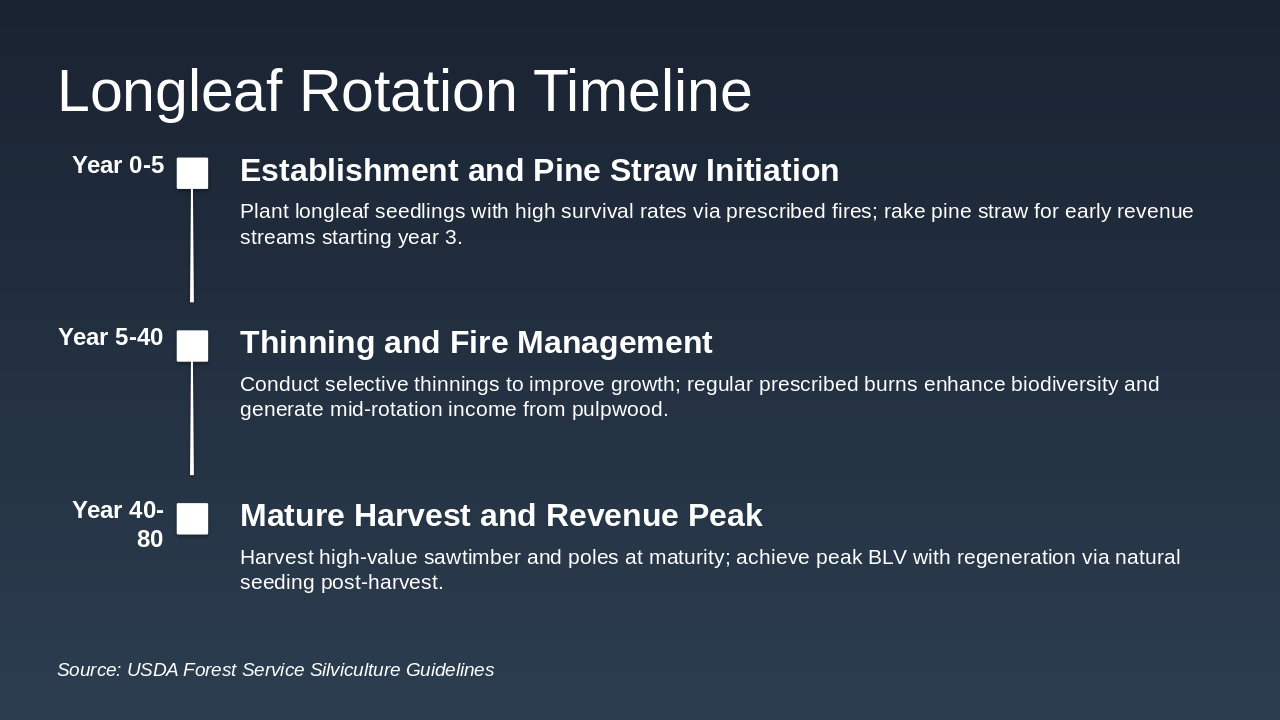 - Economic Superiority: Higher BLV ($1,800-$2,500/acre) and diverse revenue (timber, pine straw)