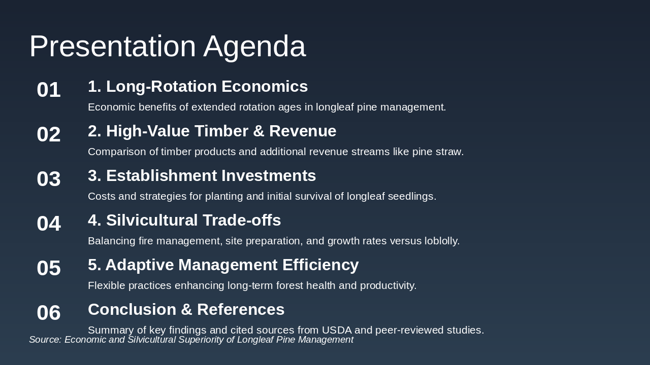 The conclusion slide highlights the economic superiority of longleaf pine, featuring higher bare land value of $1,800-$2,500 per acre and diverse revenue streams from timber and pine straw, alongside silvicultural advantages like fire resilience and efficient adaptive management. It recommends prioritizing longleaf for sustainable, resilient forestry and calls for implementing long-rotation strategies to achieve long-term gains, positioning it as the future of sustainable forestry.