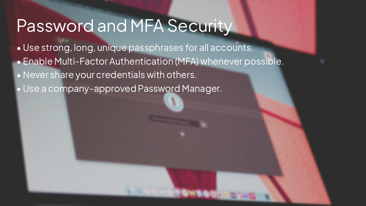 | Should you ever share your password? | Never, not even with IT staff |