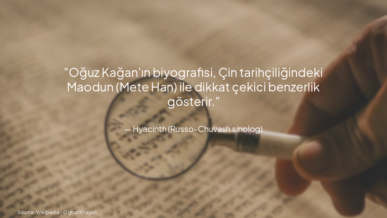 > Oğuz Kağan'ın biyografisi, Çin tarihçiliğindeki Maodun (Mete Han) ile dikkat çekici benzerlik gösterir.