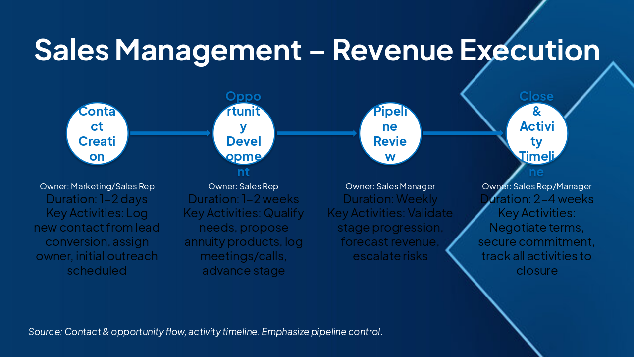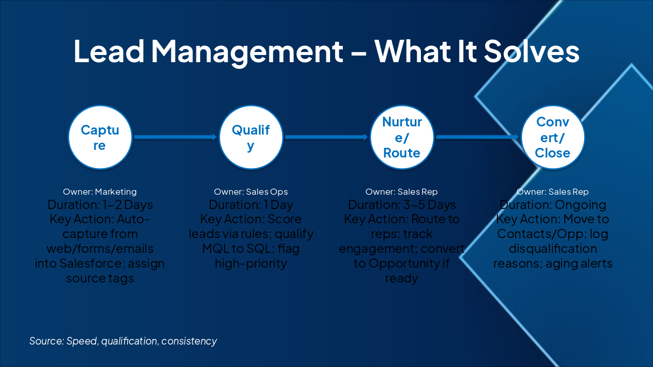 The slide outlines a Lead Management workflow in four phases: Capture (Marketing, 1-2 days: auto-capture from sources into Salesforce), Qualify (Sales Ops, 1 day: score and flag leads), Nurture/Route (Sales Rep, 3-5 days: route and track engagement), and Convert/Close (Sales Rep, ongoing: move to opportunities with alerts). It highlights how this process solves lead handling inefficiencies by defining owners, durations, and key actions for efficient progression from capture to closure.