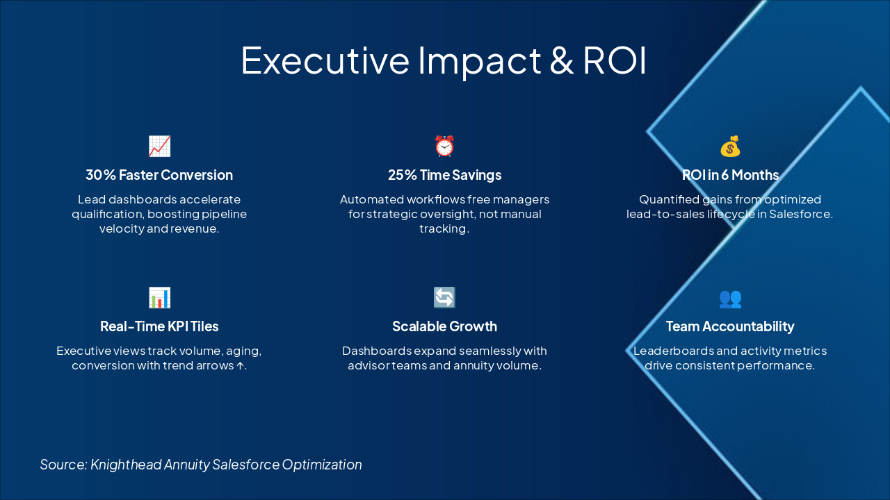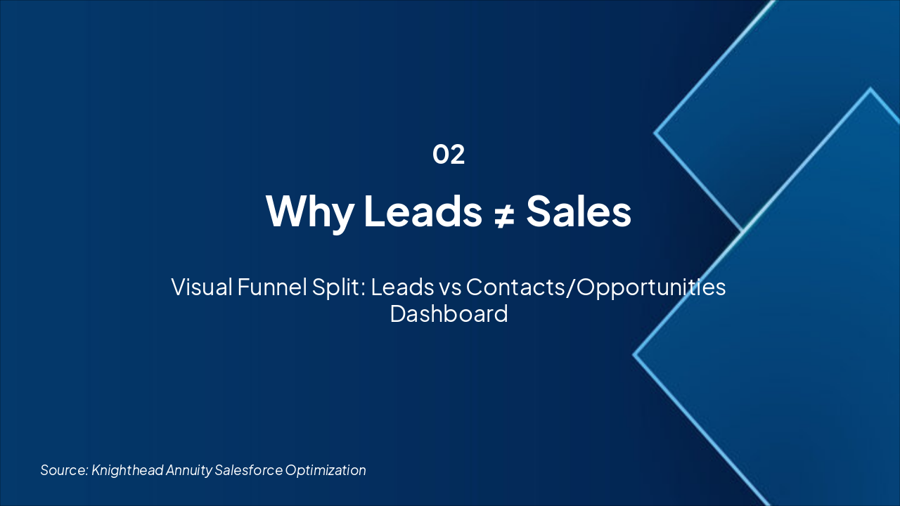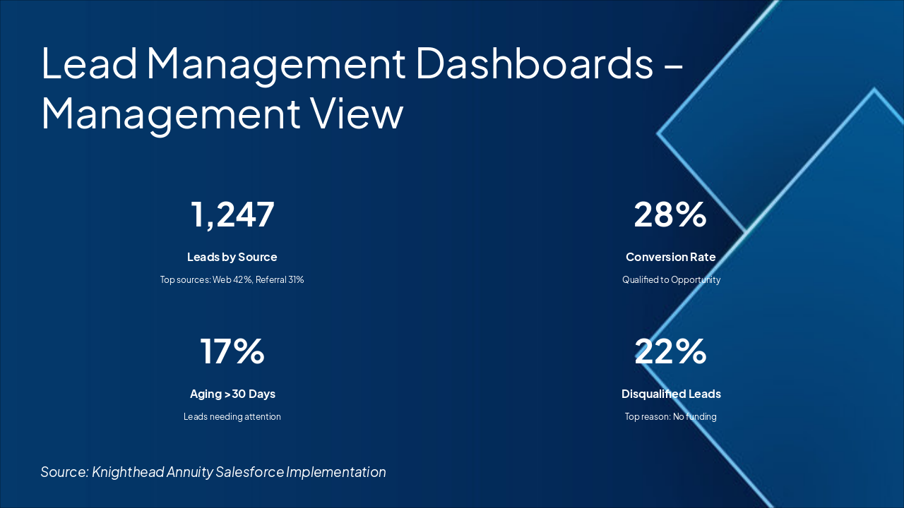 Lead Management in Salesforce addresses core pain points: accelerating lead flow, ensuring consistent qualification, and driving speed to opportunity. Visuals include a lead lifecycle diagram (circular process) and lead status bar chart showing volume by status (New, Qualified, Disqualified, Converted). Emphasizes executive control via dashboards.
