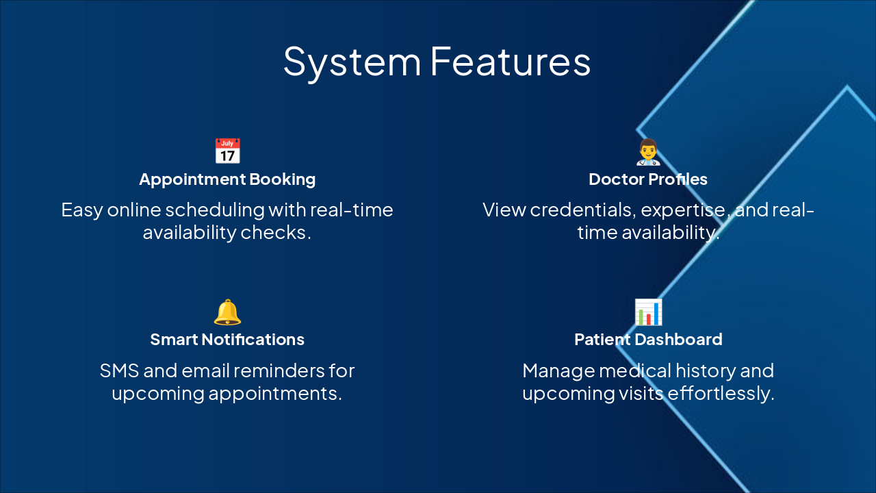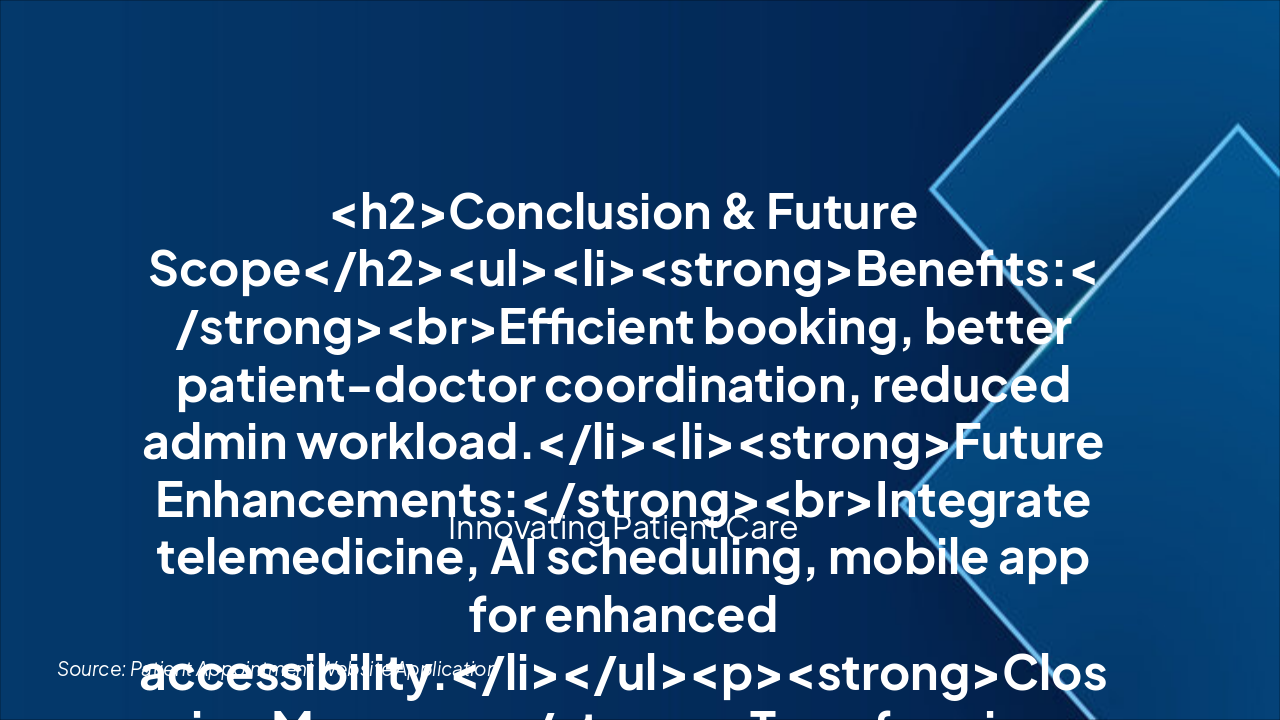<h2>Conclusion & Future Scope</h2><ul><li><strong>Benefits:</strong><br>Efficient booking, better patient-doctor coordination, reduced admin workload.</li><li><strong>Future Enhancements:</strong><br>Integrate telemedicine, AI scheduling, mobile app for enhanced accessibility.</li></ul><p><strong>Closing Message:</strong> Transforming healthcare, one appointment at a time.</p><p><em>Call-to-Action:</em> Explore the demo and provide feedback today!</p>