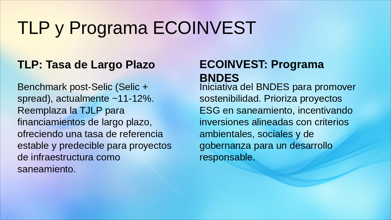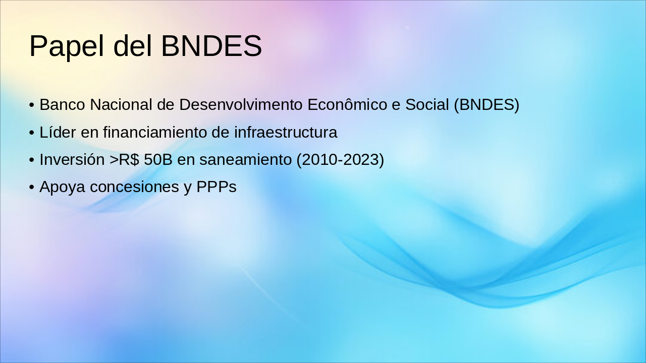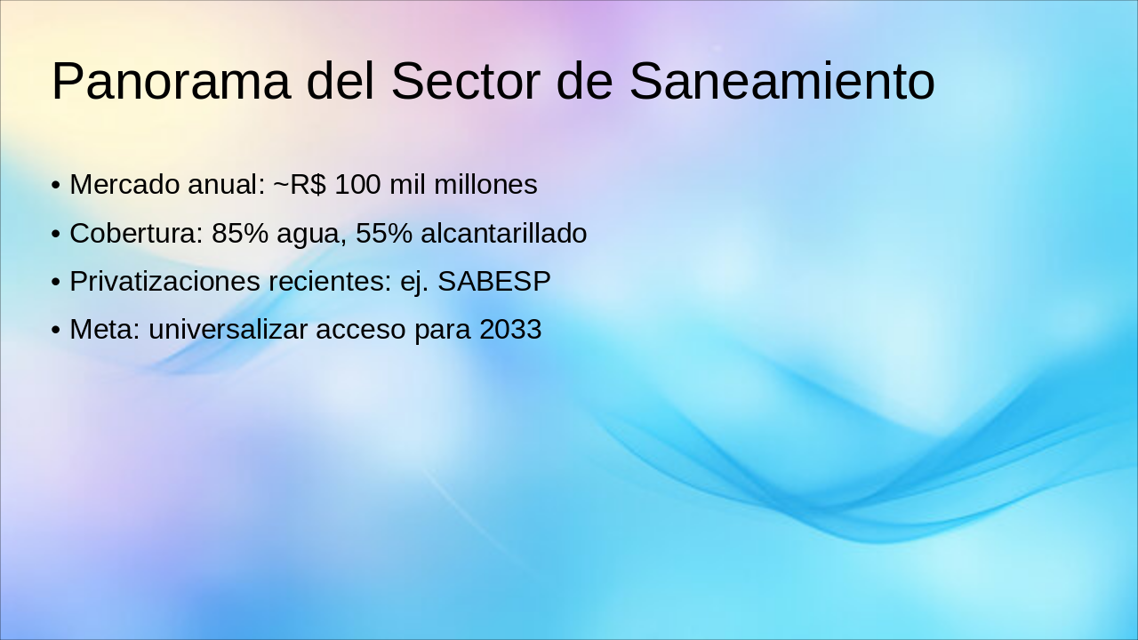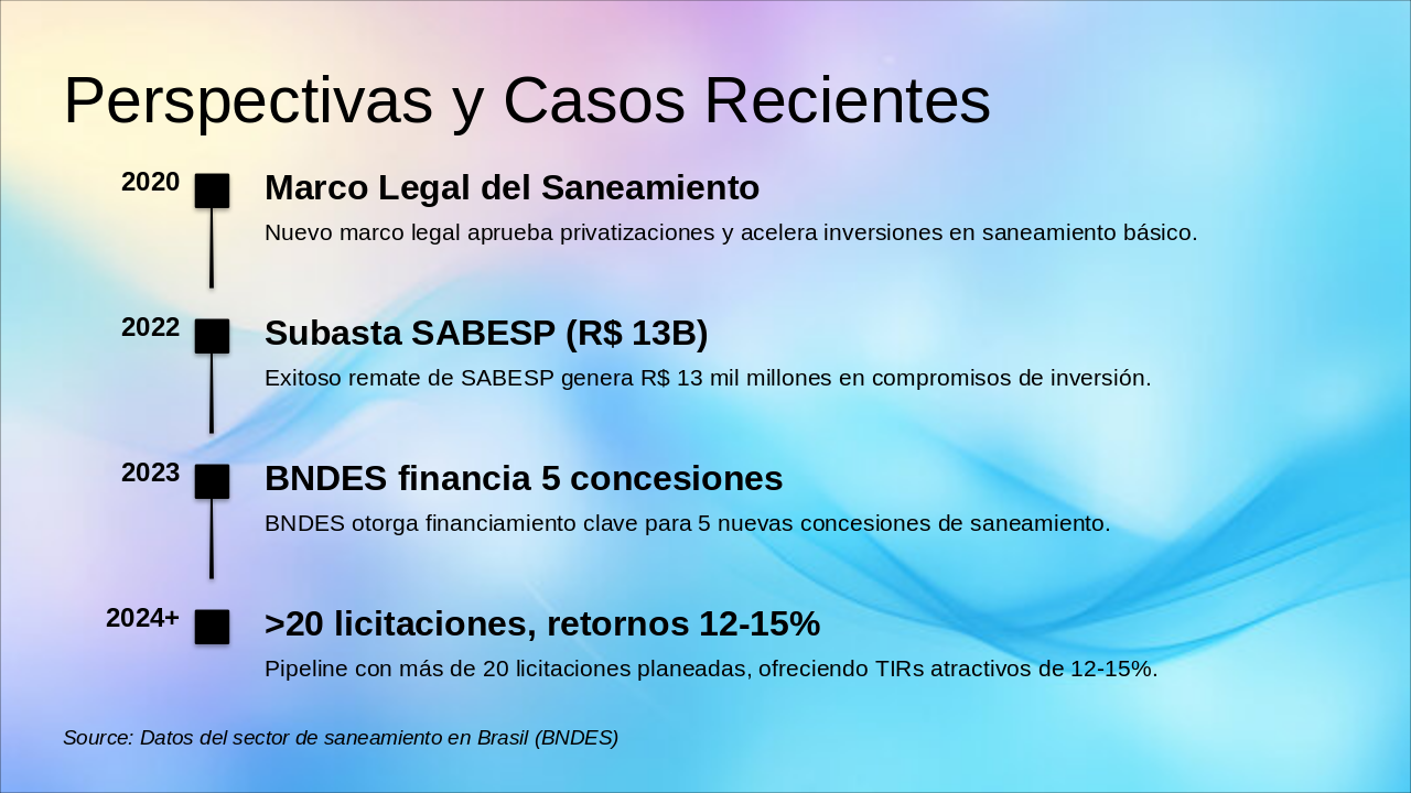 2020: Marco Legal del Saneamiento Nuevo marco legal aprueba privatizaciones y acelera inversiones en saneamiento básico. 2022: Subasta SABESP (R$ 13B) Exitoso remate de SABESP genera R$ 13 mil millones en compromisos de inversión. 2023: BNDES financia 5 concesiones BNDES otorga financiamiento clave para 5 nuevas concesiones de saneamiento. 2024+: >20 licitaciones, retornos 12-15% Pipeline con más de 20 licitaciones planeadas, ofreciendo TIRs atractivos de 12-15%.