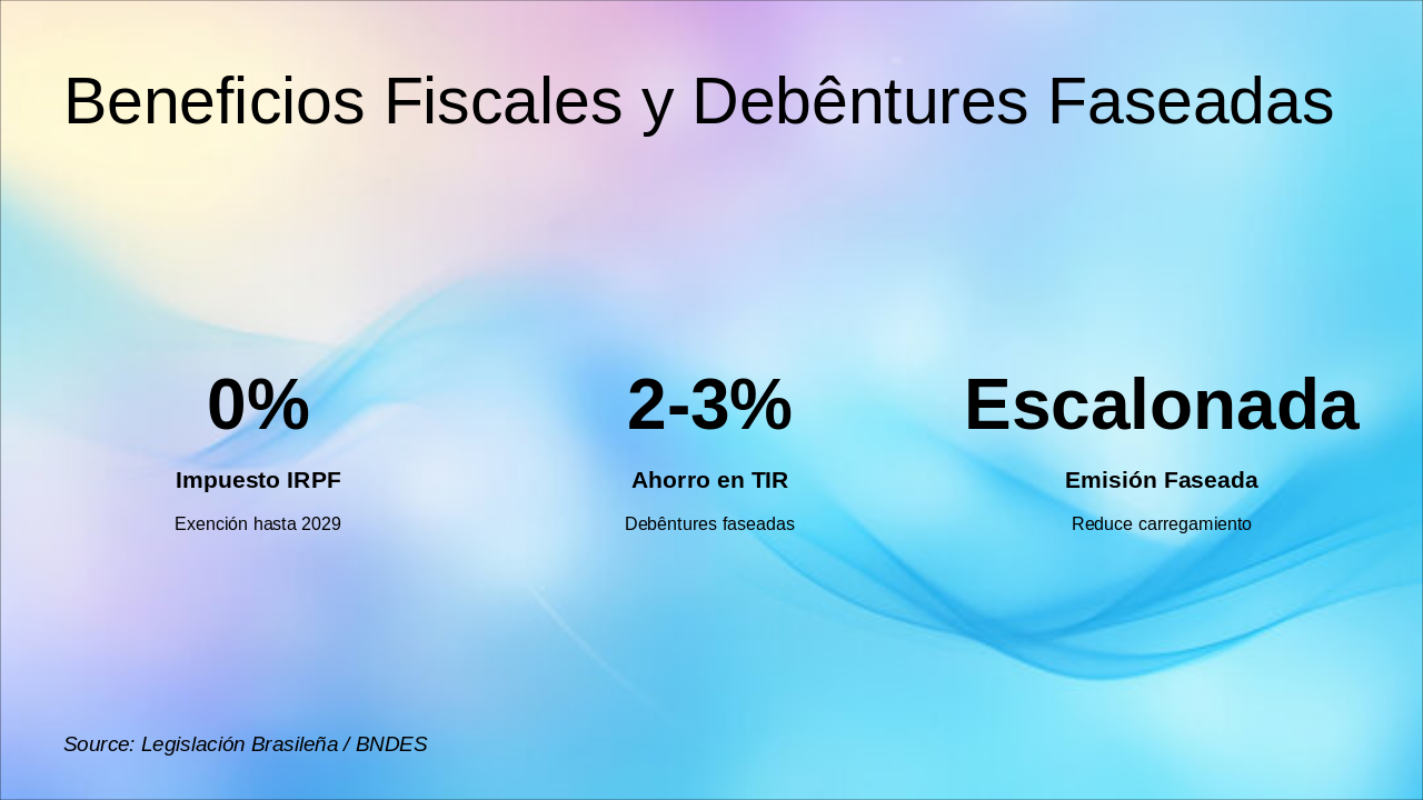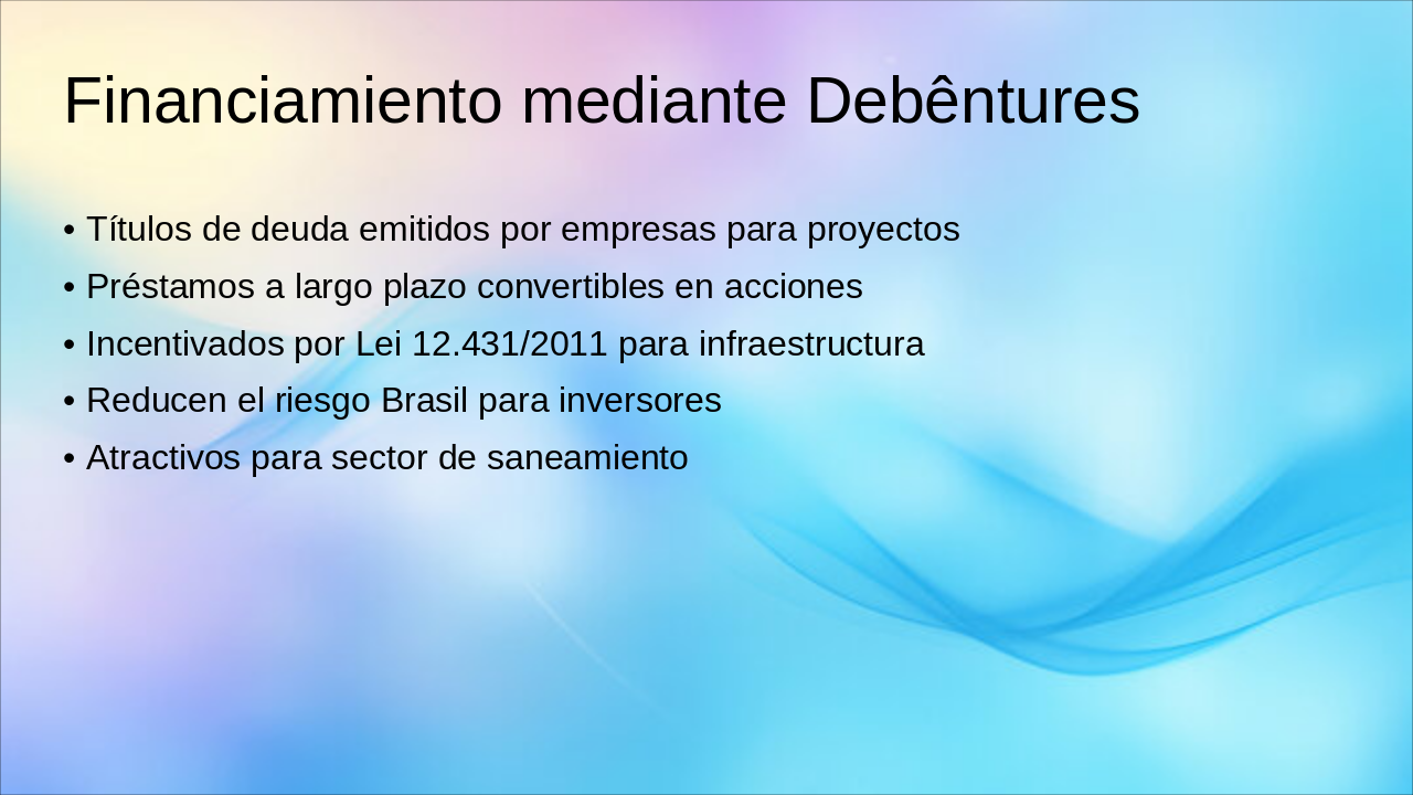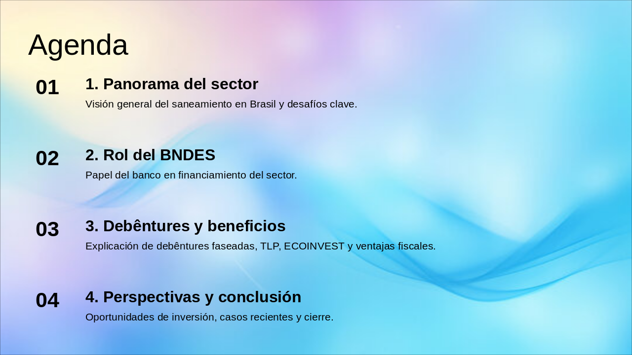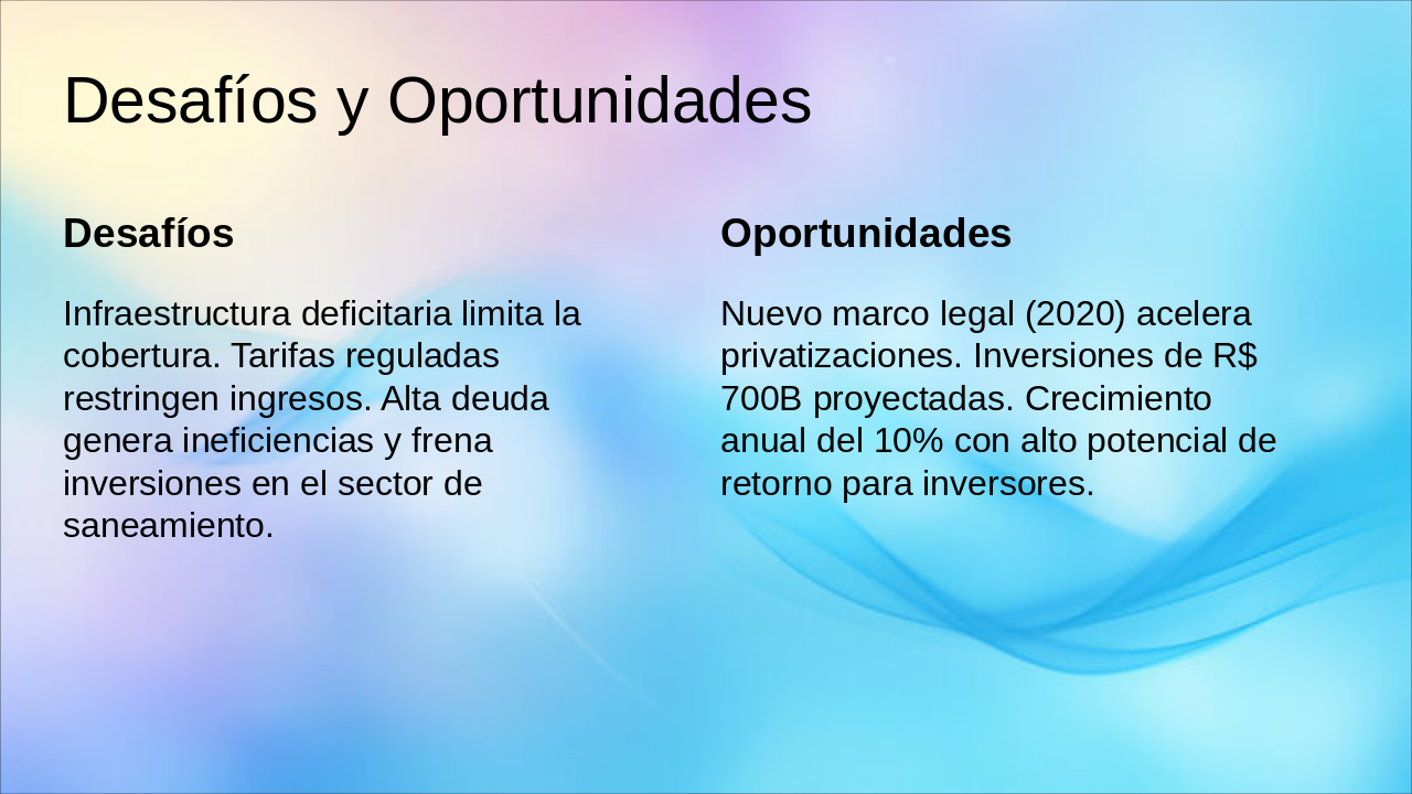 2020: Marco Legal del Saneamiento Nuevo marco legal aprueba privatizaciones y acelera inversiones en saneamiento básico. 2022: Subasta SABESP (R$ 13B) Exitoso remate de SABESP genera R$ 13 mil millones en compromisos de inversión. 2023: BNDES financia 5 concesiones BNDES otorga financiamiento clave para 5 nuevas concesiones de saneamiento. 2024+: >20 licitaciones, retornos 12-15% Pipeline con más de 20 licitaciones planeadas, ofreciendo TIRs atractivos de 12-15%.