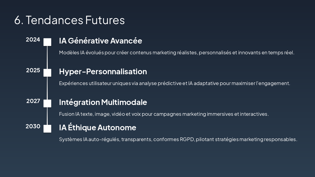 { "headers": [ "Phase", "Description", "Outils IA" ], "rows": [ [ "Collecte données", "Rassemblement données clients, comportements et marché via tracking multi-sources", "Google Analytics, CRM (HubSpot), APIs données" ], [ "Analyse IA", "Traitement avancé, segmentation et prédictions via algorithmes IA", "Machine Learning (TensorFlow), NLP, BigQuery AI" ], [ "Personnalisation", "Création de contenus et campagnes sur mesure adaptées aux segments", "Algorithmes recommandation (comme Netflix), Dynamic Content Tools (Adobe Sensei)" ], [ "Optimisation", "Ajustements automatisés en temps réel basés sur performances", "A/B Testing IA, Predictive Analytics, AutoML" ] ] }