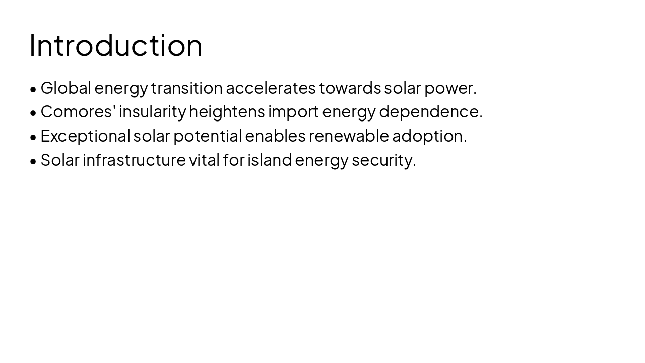 Bu slayt, "Güneş Enerji Santrallerinin Taşıyıcı Sistemleri Üzerine Etkileyen Yükler: Komorlar Örneği" başlıklı bir çalışmanın başlık sayfasını sunar. İçerik, yazar Laila Mahoulida Saodiki, Aksaray Üniversitesi, danışman Prof. Dr. Fatih Kürşat Fırat ve 2025 yılını belirtir.
