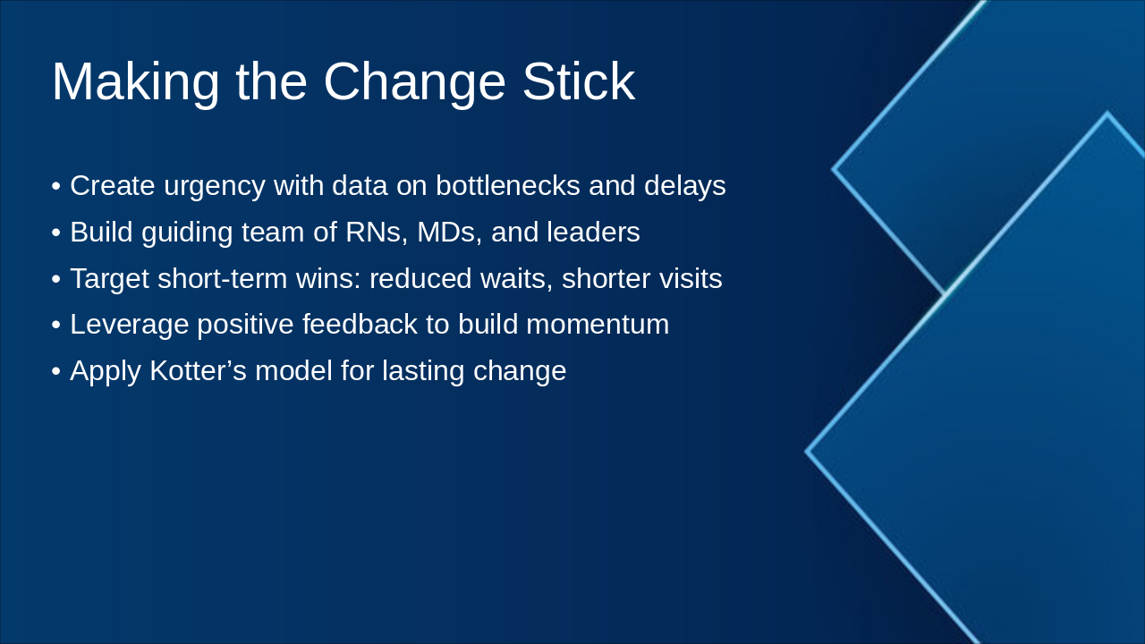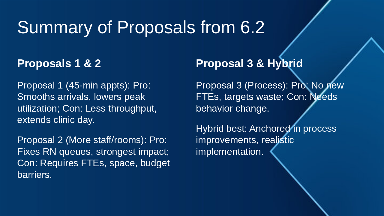 | Proposal 1 (45-min appts): Pro: Smooths arrivals, lowers peak utilization; Con: Less throughput, extends clinic day.