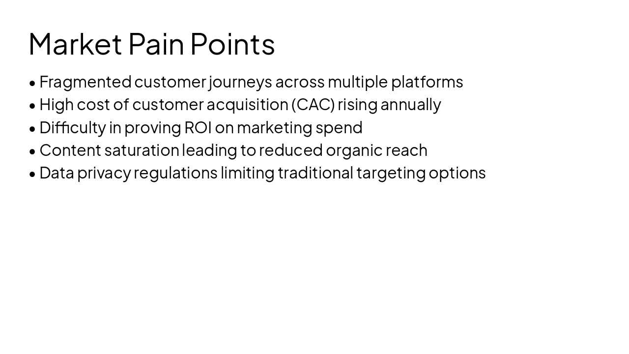 This pitch deck outlines a marketing startup revolutionizing brand growth through data-driven creativity. It covers key challenges like fragmented customer journeys and high CAC, our precision targeting and ROI optimization solutions, a $600B TAM in