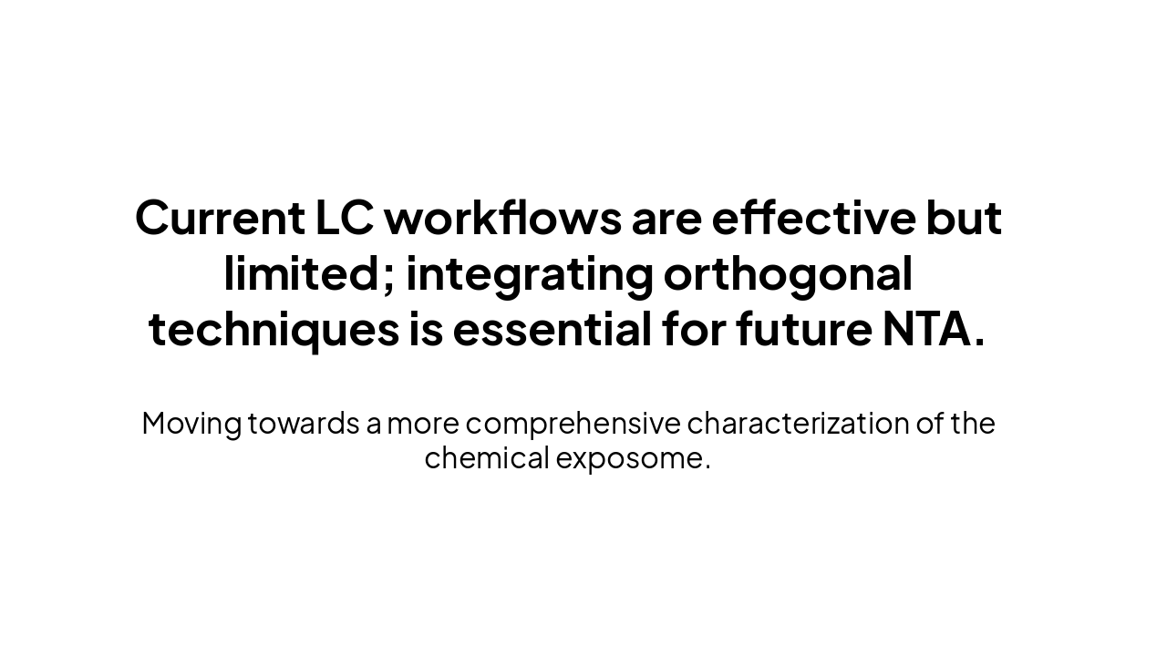Current LC workflows are effective but limited; integrating orthogonal techniques is essential for future NTA.