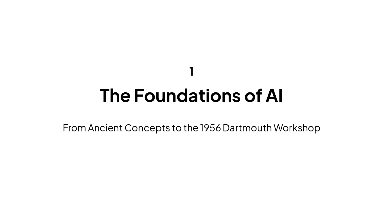 Antiquity: Mythical Roots Myths and stories of artificial beings created by craftsmen. 1940s: Computer Age Beginnings Development of programmable digital computers based on formal logic. 1956: The Birth of AI Founding workshop at Dartmouth College; introduction of 'Logic Theorist'.