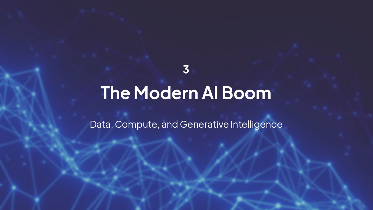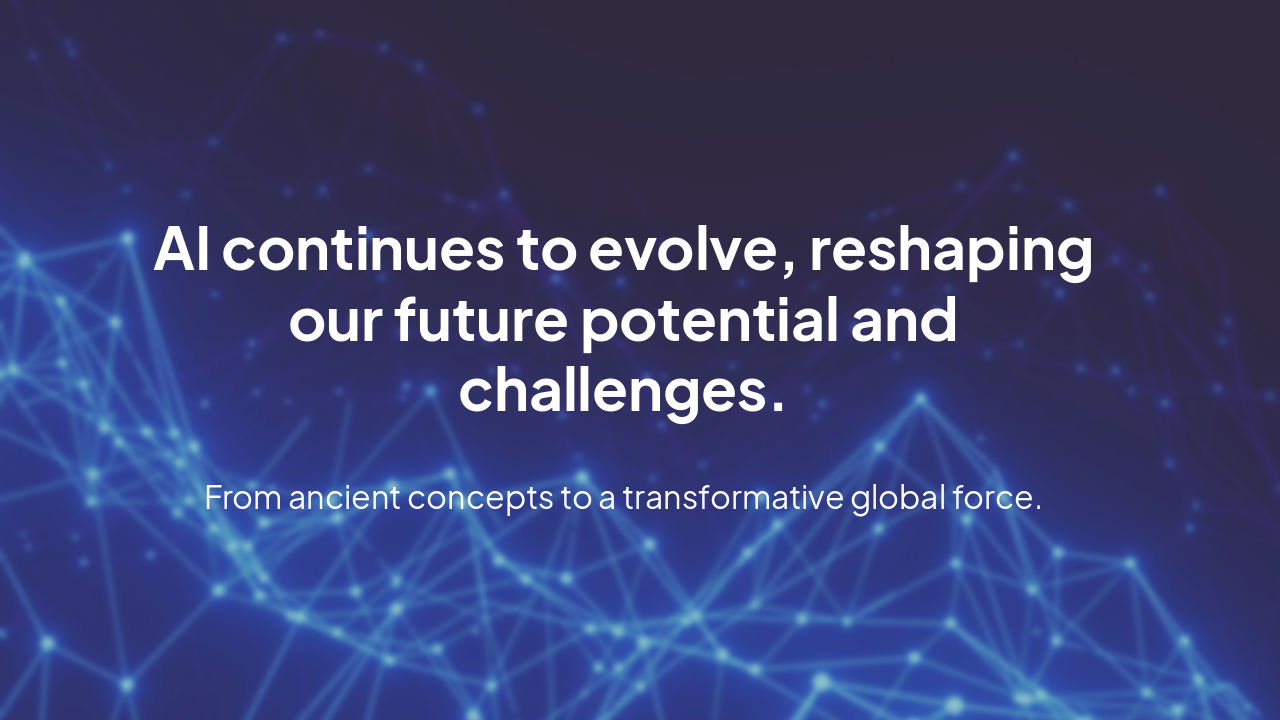 This presentation explores the evolution of Artificial Intelligence, from mythical origins and the 1956 Dartmouth workshop, through AI winters and expert systems, to modern breakthroughs in deep learning, transformers, LLMs, and future ethical and社al