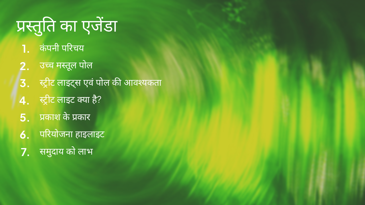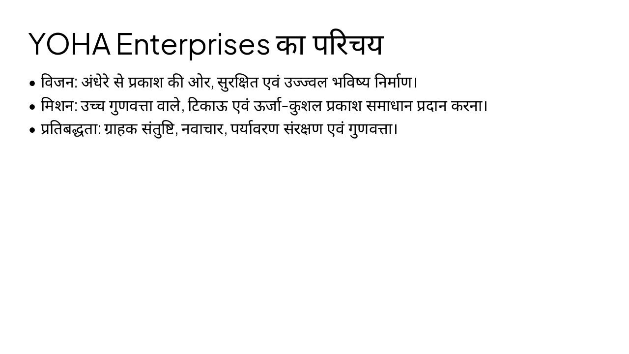 Create a professional Hindi presentation for YOHA Enterprises with the tagline "अंधेरे से प्रकाश की ओर". Slides Outline: 1. Cover Slide – YOHA Enterprises | अंधेरे से प्रकाश की ओर | Presented By YOHA Enterprises 2. Company Introduction – Vision, Mission, commitment to quality lighting solutions. 3. High Mast Pole – 10 meter height, 6 flood lights (150W each), GI galvanized steel, rust resistant, wide area coverage, low maintenance, weather resistant, cost effective. 4. Need of Street Lights & Poles – Safety, accident prevention, women & children safety, crime reduction, village development, beautification. 5. What is Street Light? – Definition, usage areas (roads, markets, rural areas), LED and Solar advantages. 6. Types of Lights – LED Street Light, Solar Street Light, High Mast Light. 7. Project Highlight – Sanjeet Nagar High Mast installation (10 poles installed, Diwali inauguration, city illuminated). 8. Benefits to Community – Safety, identity, development, energy efficiency. 9. Thank You Slide – Professional closing. Use clean layout, modern design, icons, and professional formatting.