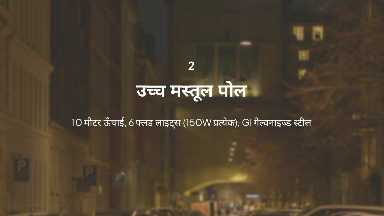 10 मीटर ऊँचाई, 6 फ्लड लाइट्स (150W प्रत्येक), GI गैल्वनाइज्ड स्टील