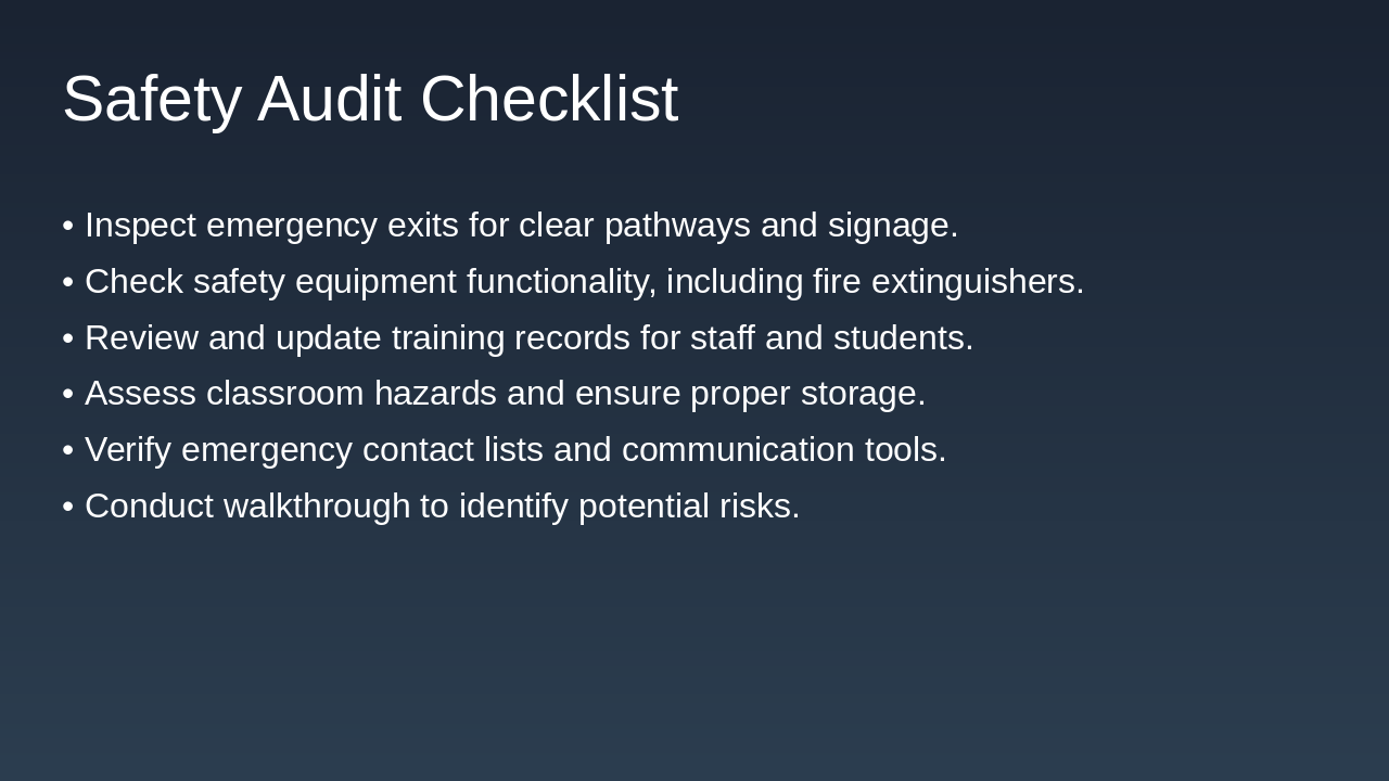 - Perform safety audits and maintain emergency kits.