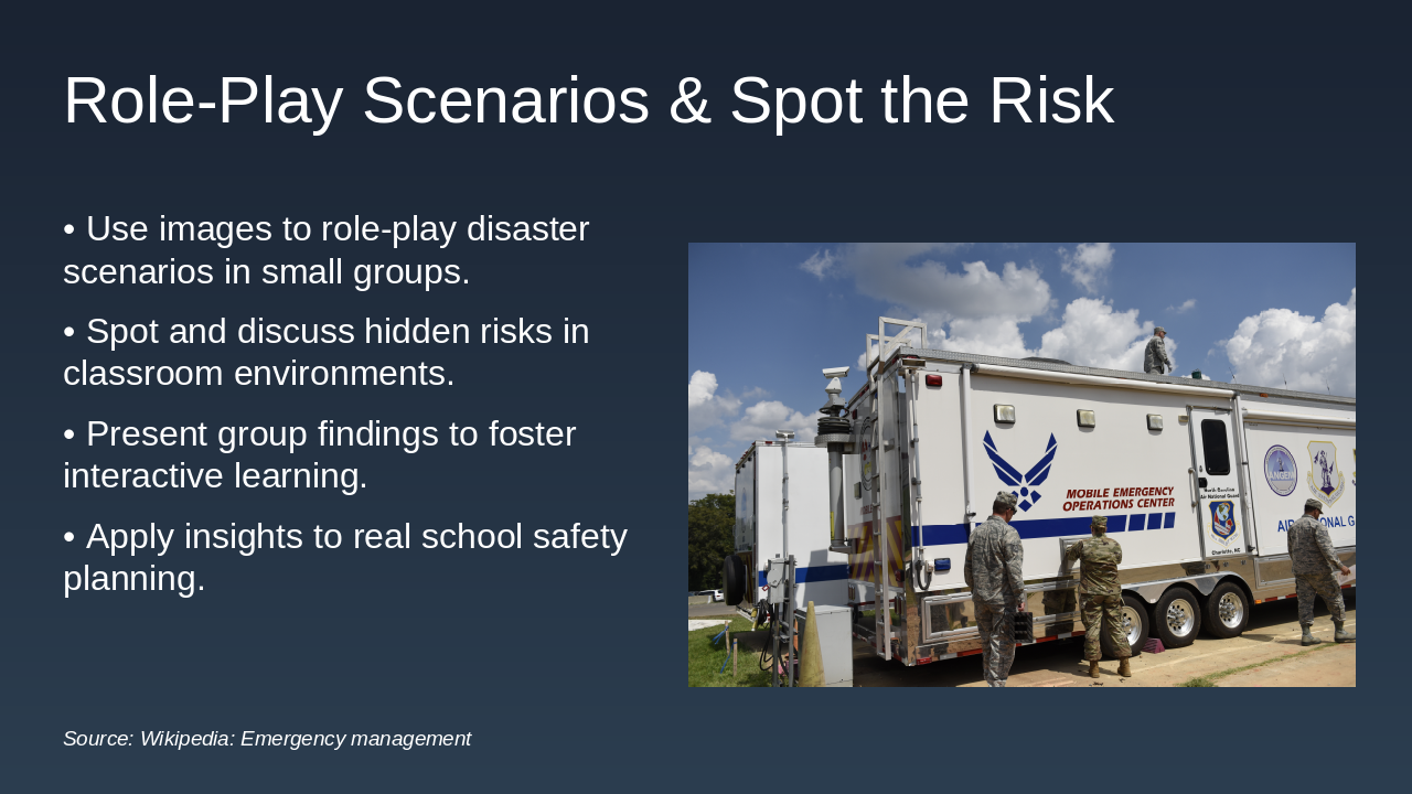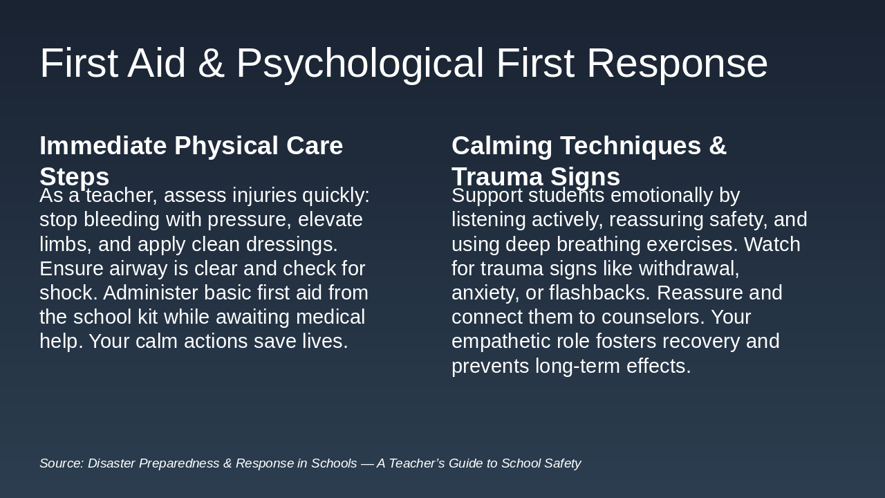 - Prioritize first aid, psychological support, and vulnerability awareness.