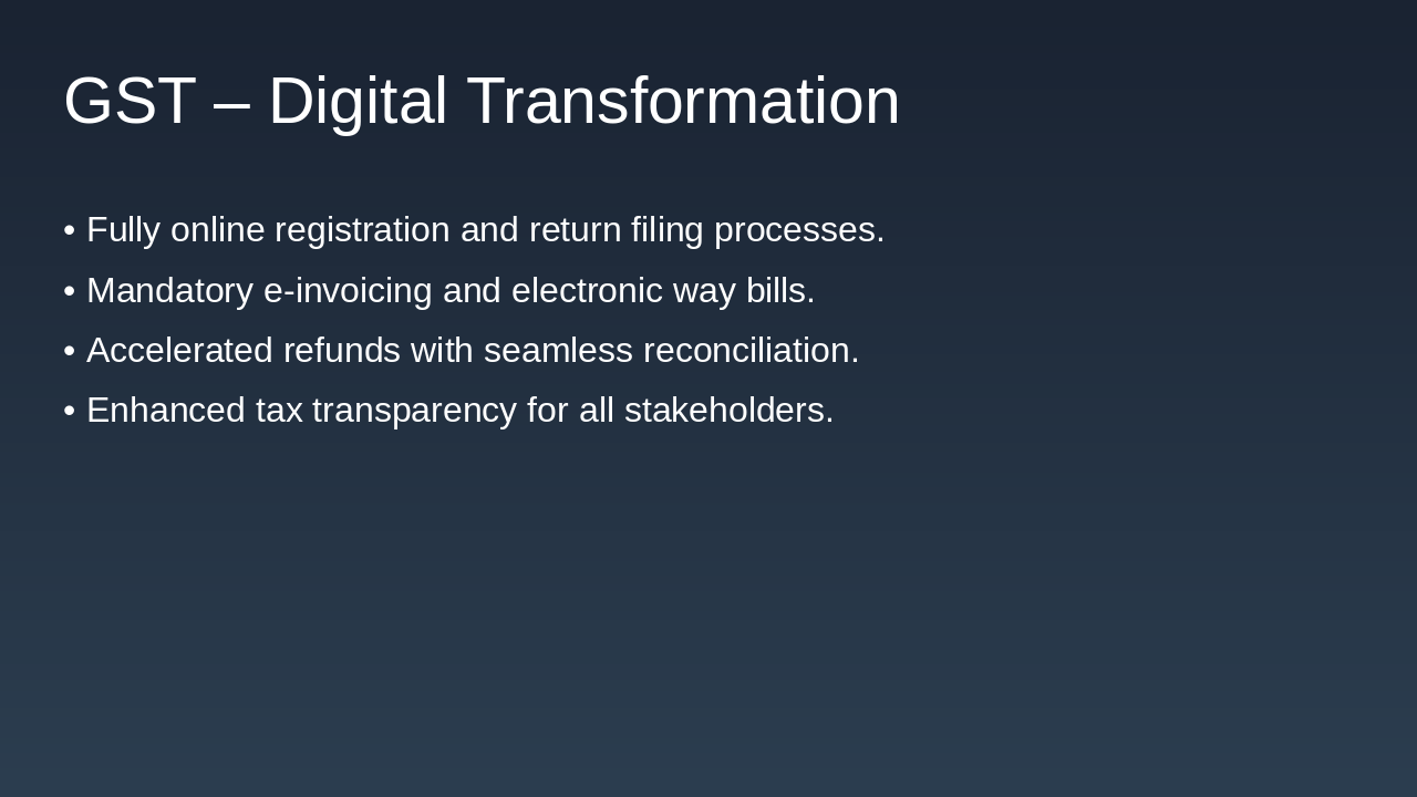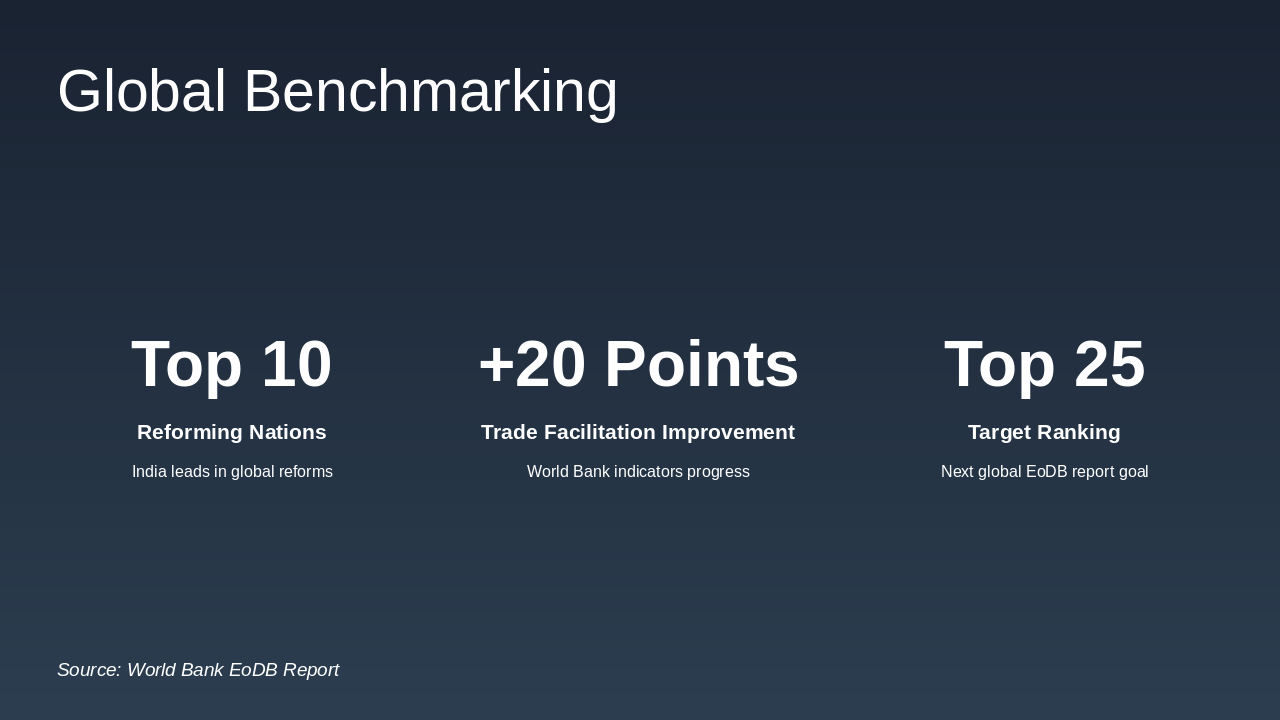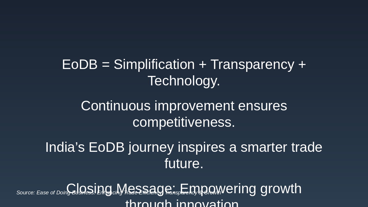The title slide, titled "Ease of Doing Business (EoDB)" and marked as a title type, highlights the core theme of "Enhancing Efficiency, Transparency & Growth." Its subtitle specifies that these improvements target professionals, learners, and trade participants.