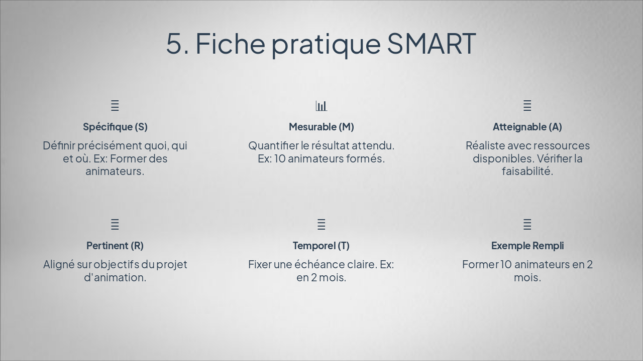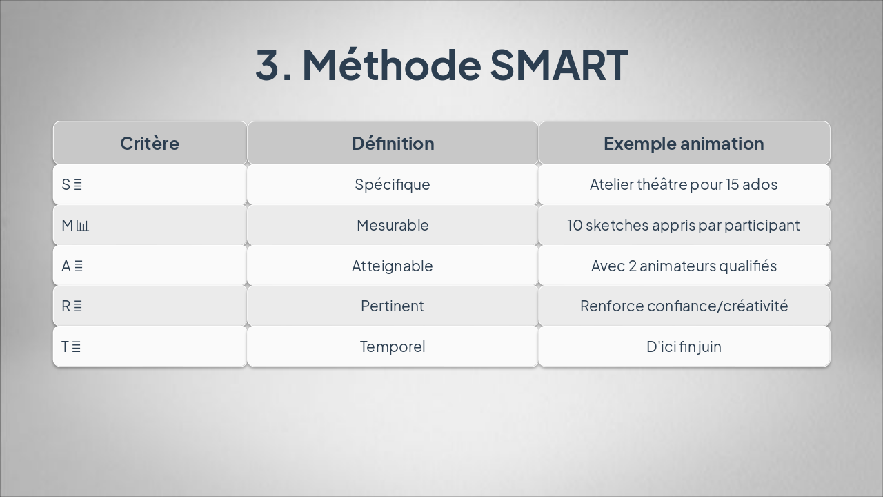 { "headers": [ "Étape", "Description", "Responsable" ], "rows": [ [ "1. Identifier le besoin", "Définir le problème ou l’opportunité à adresser dans le projet d’animation.", "Animateur principal" ], [ "2. Appliquer SMART", "Vérifier que l’objectif respecte S (Spécifique), M (Mesurable), A (Atteignable), R (Pertinent), T (Temporel).", "Animateur" ], [ "3. Rédiger l’objectif", "Formuler l’objectif de façon claire, concise et actionnable.", "Animateur" ], [ "4. Valider avec l’équipe", "Partager le projet d’objectif et recueillir retours/approbation.", "Équipe d’animation" ] ] }