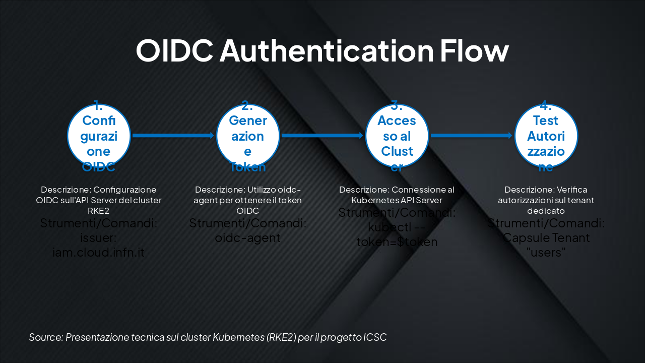 { "headers": [ "Passo", "Descrizione", "Strumenti/Comandi" ], "rows": [ [ "1. Configurazione OIDC", "Configurazione OIDC sull'API Server del cluster RKE2", "issuer: iam.cloud.infn.it" ], [ "2. Generazione Token", "Utilizzo oidc-agent per ottenere il token OIDC", "oidc-agent" ], [ "3. Accesso al Cluster", "Connessione al Kubernetes API Server", "kubectl --token=$token" ], [ "4. Test Autorizzazione", "Verifica autorizzazioni sul tenant dedicato", "Capsule Tenant \"users\"" ] ] }
