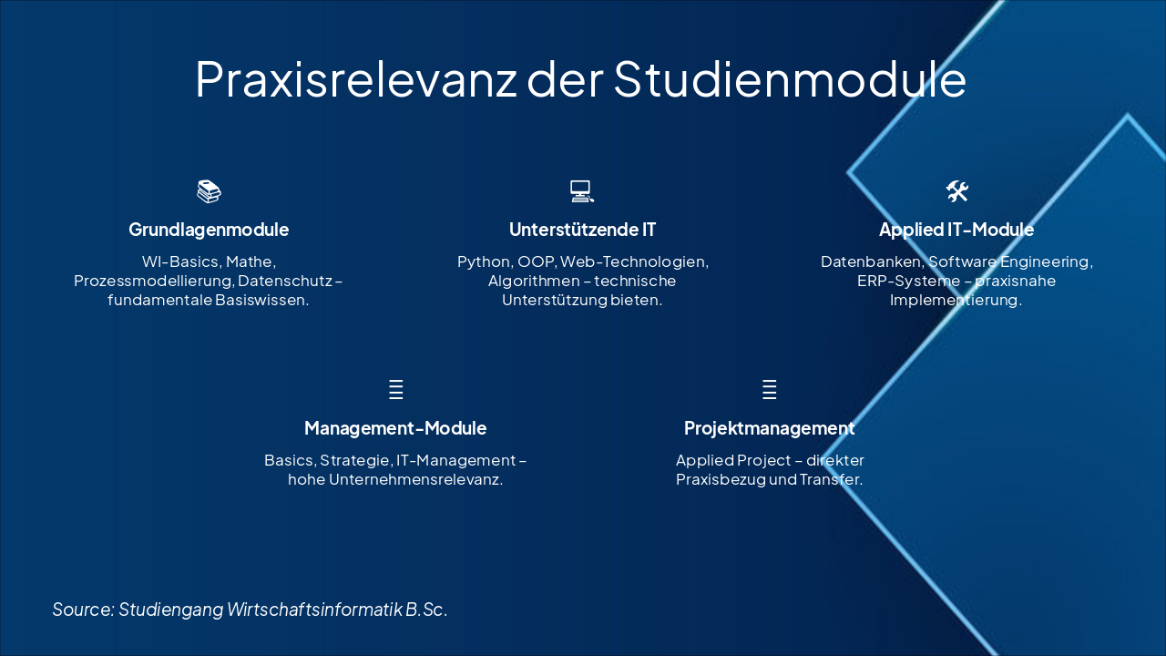 { "features": [ { "icon": "📚", "heading": "Grundlagenmodule", "description": "WI-Basics, Mathe, Prozessmodellierung, Datenschutz – fundamentale Basiswissen." }, { "icon": "💻", "heading": "Unterstützende IT", "description": "Python, OOP, Web-Technologien, Algorithmen – technische Unterstützung bieten." }, { "icon": "🛠️", "heading": "Applied IT-Module", "description": "Datenbanken, Software Engineering, ERP-Systeme – praxisnahe Implementierung." }, { "icon": "👔", "heading": "Management-Module", "description": "Basics, Strategie, IT-Management – hohe Unternehmensrelevanz." }, { "icon": "🎯", "heading": "Projektmanagement", "description": "Applied Project – direkter Praxisbezug und Transfer." } ] }