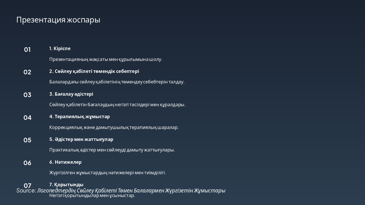 Бұл слайд презентация жоспарын көрсетеді, ол кіріспеден бастап қорытындыға дейін жеті негізгі бөлімнен тұрады. Тақырыптар сөйлеу қабілеті төмендігінің себептерін, бағалау әдістерін, терапиялық жұмыстарды, әдістер мен жаттығуларды, сондай-ақ нәтижелерді қамтиды.
