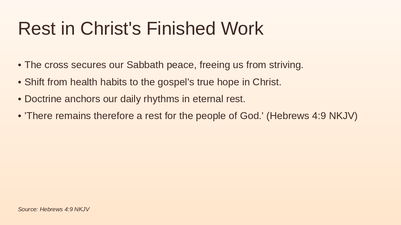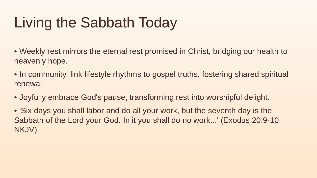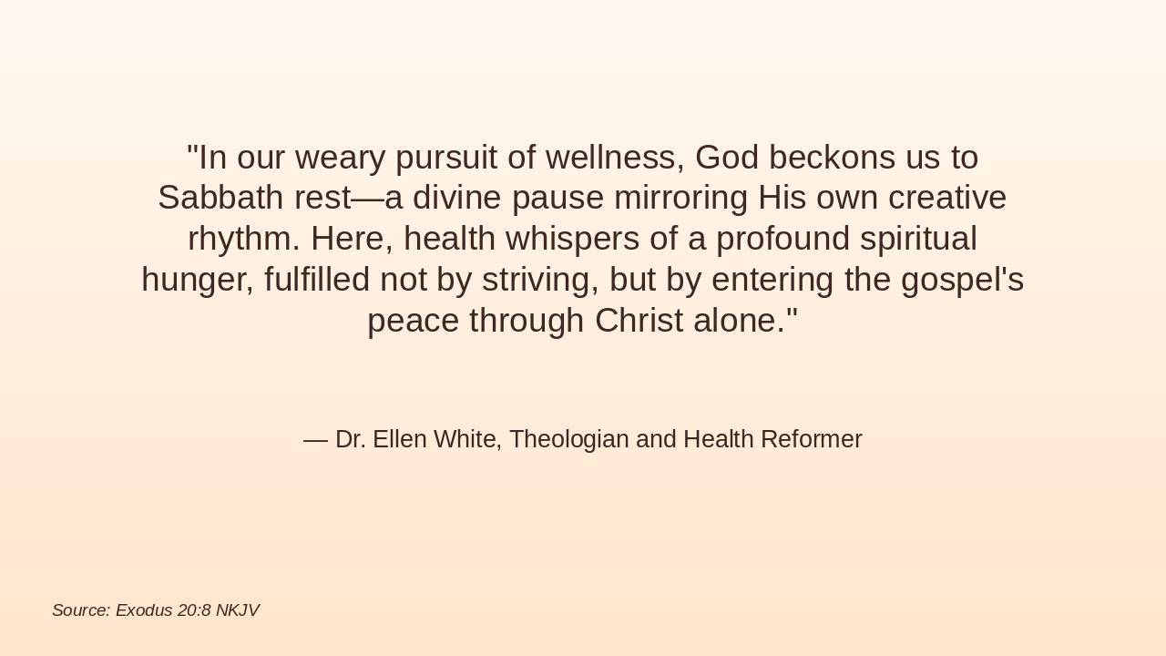 'Remember the Sabbath day, to keep it holy.' (Exodus 20:8 NKJV) - Health points to a deeper need. - Sabbath models God's rhythm of work and rest. - Enter His peace beyond self-effort.