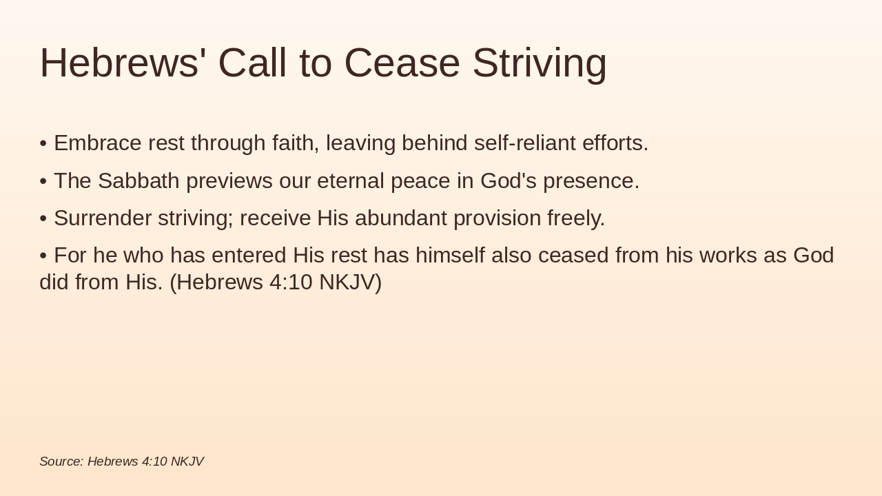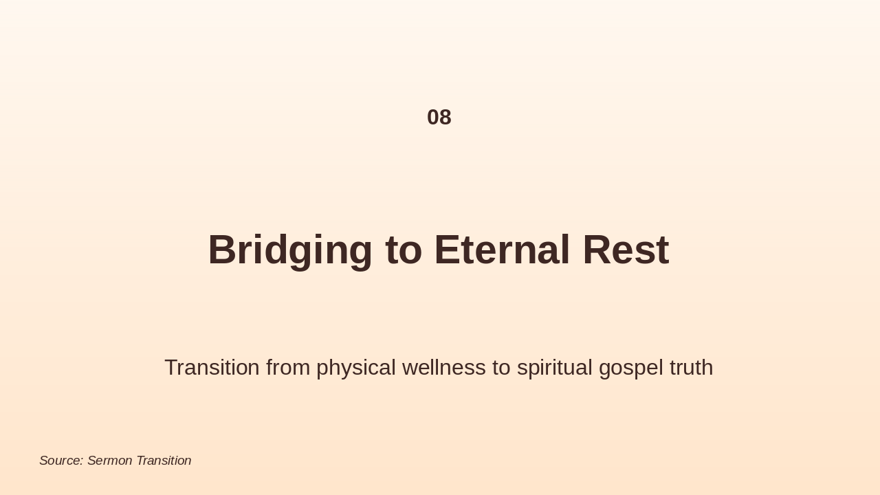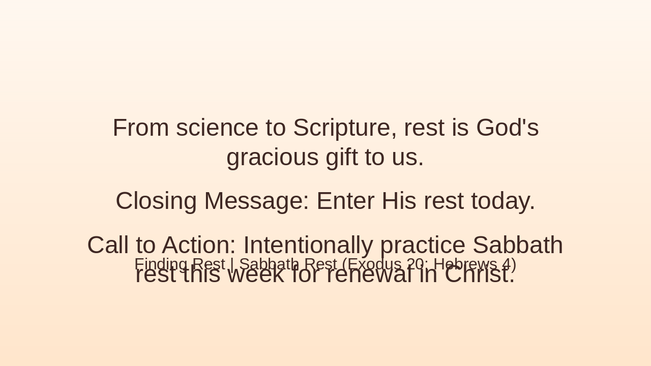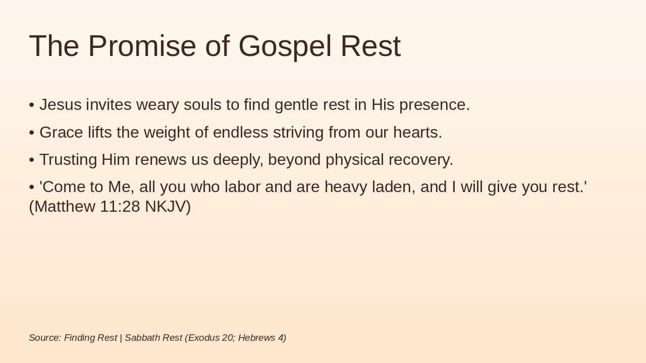'Remember the Sabbath day, to keep it holy.' (Exodus 20:8 NKJV) - Health points to a deeper need. - Sabbath models God's rhythm of work and rest. - Enter His peace beyond self-effort.