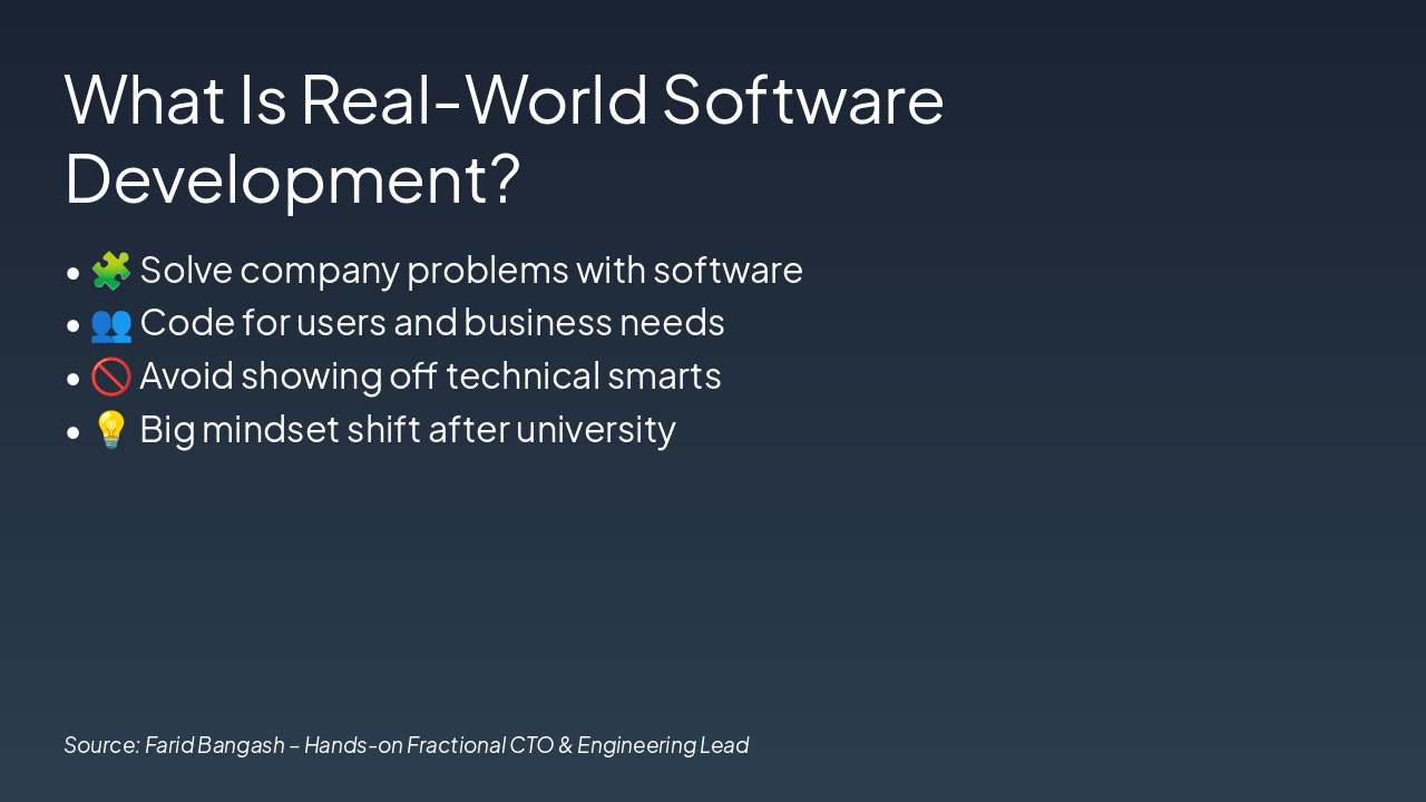 Make a presentation about "Introduction to Real-World Software Development" Farid Bangash – Hands-on Fractional CTO & Engineering Lead 🟦 Slide 1 – Title (1 minute) What you say: Good afternoon everyone. Thank you for joining today, and thank you to the University of Greater Manchester for inviting me. My name is Farid Bangash. I work as a hands-on Fractional CTO and Engineering Lead. Today, I want to talk to you about real-world software development — how software is actually built in industry, not just how we learn it in books. 🟦 Slide 2 – Who Am I? (2 minutes) What you say: I have been working in software development for over 15 years. During this time, I have worked with startups and growing companies. I’ve helped teams take an idea, turn it into a product, and then scale it for real users. I still write code myself, but I also lead teams and make technical decisions. Today’s talk is not about my career. It’s about helping you understand what to expect when you enter the software industry. 🟦 Slide 3 – What Students Think vs Reality (3 minutes) What you say: Let me start with a simple question. Many students think software development is mostly about coding. In reality: You don’t work alone Requirements change You work with many people And problems are often unclear Coding is important, but it is only one part of the job. (Pause, smile) Real software development is messy — and that’s normal. 🟦 Slide 4 – What Is Real-World Software Development? (3 minutes) What you say: Real-world software development is about solving problems. A company has a problem. Software is just the tool to solve it. You don’t write code to show how smart you are. You write code to help users and businesses. This is a big mindset change after university. 🟦 Slide 5 – Roles in a Software Team (4 minutes) What you say: In real companies, software is built by teams, not individuals. You will usually work with: Software engineers A tech lead or engineering lead A product manager Designers QA testers Cloud or DevOps engineers Everyone has a role. If one role fails, the whole system suffers. Software development is a team sport. 🟦 Slide 6 – Agile Working (4 minutes) What you say: You may hear the word Agile a lot. Agile simply means: Working in small steps Getting feedback early Improving continuously Agile does not mean: No planning No structure Chaos Good teams plan carefully, but they accept that change will happen. 🟦 Slide 7 – Journey: Idea to Product (5 minutes) What you say: Let’s look at the real journey of software. It usually starts with: A problem Or an idea Then: A small first version (MVP) Users give feedback Bugs are found Features change After launch, the work does not stop. Maintenance is often more work than building. 🟦 Slide 8 – What Changes After University (3 minutes) What you say: At university: Assignments have clear questions Deadlines are known Marks are the result In industry: Problems are unclear Deadlines move Users complain Bugs affect real people This can feel stressful at first — and that’s normal. 🟦 Slide 9 – Coding in the Real World (3 minutes) What you say: In real jobs: You read more code than you write You fix bugs more than build new features You work on old code written by others One important rule: Write code for humans, not just computers. Your future teammate should understand your code. 🟦 Slide 10 – Common Mistakes (4 minutes) What you say: I see many junior developers make the same mistakes: Over-engineering simple problems Not asking questions Ignoring communication Focusing only on technology, not the problem Asking questions is a strength, not a weakness. 🟦 Slide 11 – Skills That Really Matter (4 minutes) What you say: Programming languages change. What stays important: Communication Problem solving Debugging Teamwork Learning fast A good developer is not the one who knows everything — but the one who can learn quickly. 🟦 Slide 12 – How You Can Prepare Now (4 minutes) What you say: You don’t need to wait for graduation. You can: Build small projects Work in groups Learn Git Do internships Read real code Focus on understanding, not memorising. 🟦 Slide 13 – Your First Job (2 minutes) What you say: In your first job: You are not expected to know everything You are expected to learn Your attitude matters a lot Be curious. Be humble. Be reliable. 🟦 Slide 14 – Key Takeaways (2 minutes) What you say: To summarise: Software development is about solving problems Teamwork matters Communication is critical Learning never stops University gives you the foundation. Industry teaches you reality. 🟦 Slide 15 – Q&A (15–20 minutes) What you say: Thank you for listening. I’d now like to open the session for questions. You can ask about software development, careers, teams, or anything else. (Smile, relax, encourage questions)