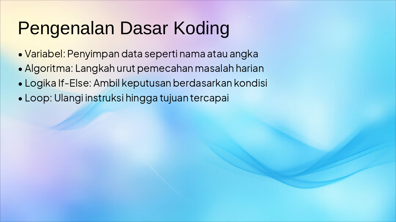 ], [ "2. Buat Proyek Mini", "Ciptakan game sederhana: Tebak Angka, Kucing Bergerak, atau Pong mini. Fokus pada logika dasar.", "45-60 menit