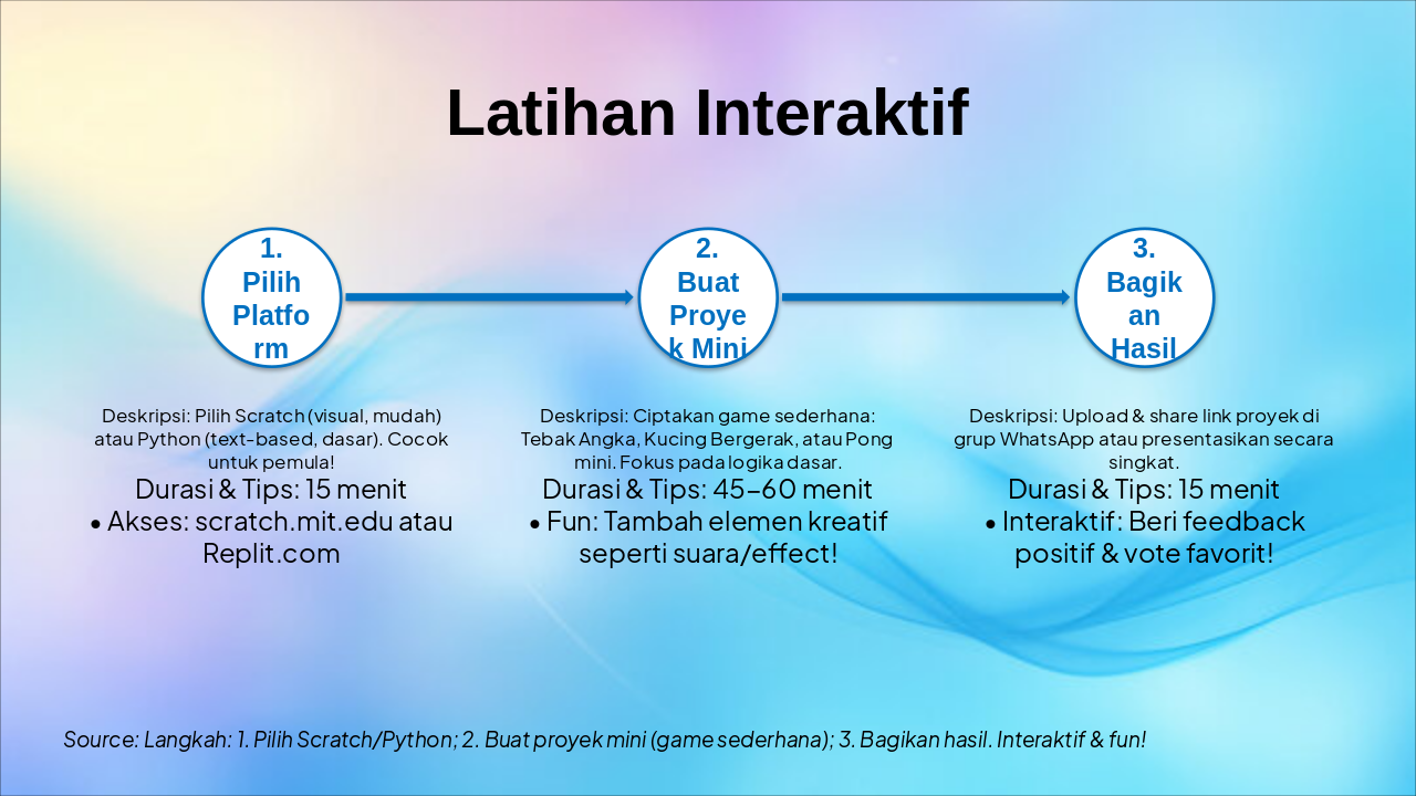 Source: Langkah: 1. Pilih Scratch/Python; 2. Buat proyek mini (game sederhana); 3. Bagikan hasil. Interaktif & fun!