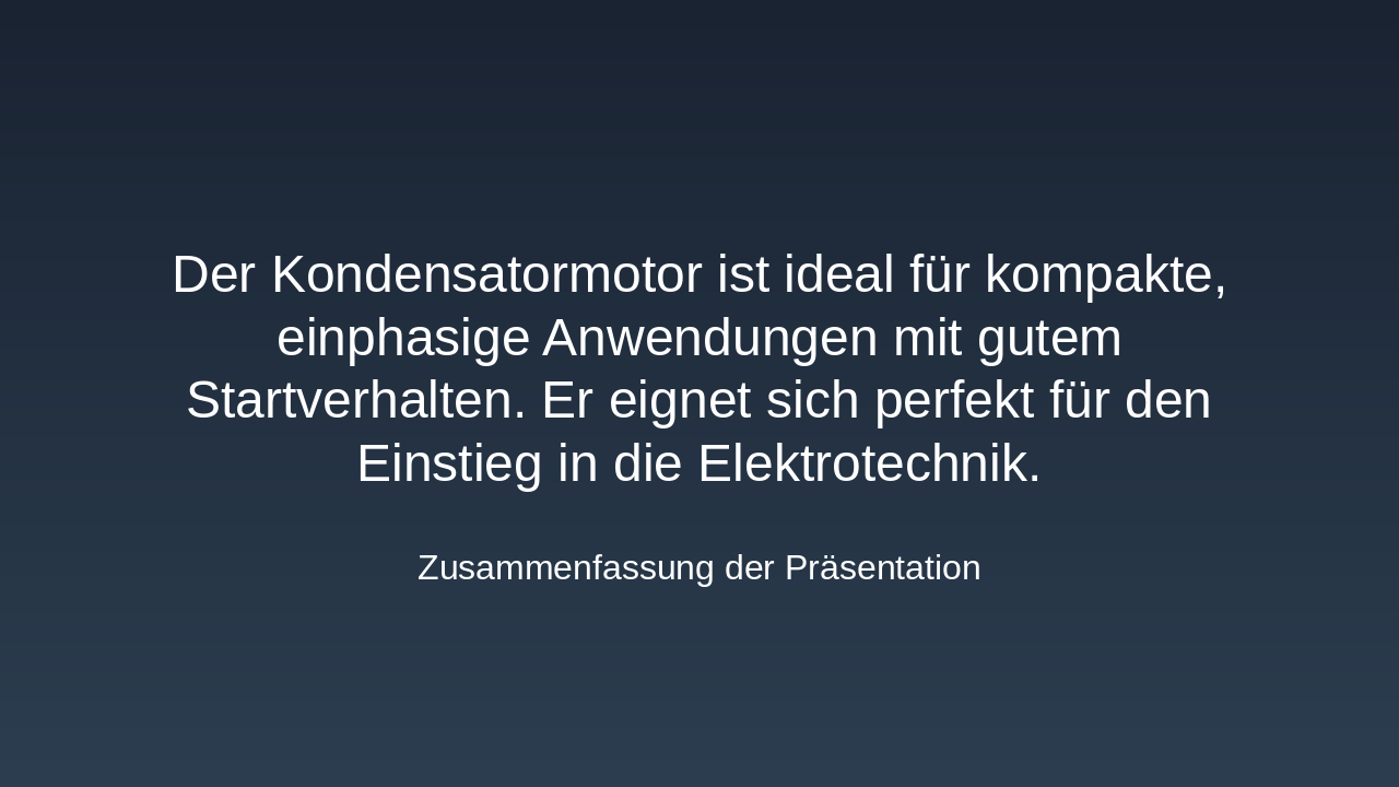 The slide's title, "Zusammenfassung," serves as a conclusion to the presentation, summarizing key points on the capacitor motor. It highlights that the capacitor motor is ideal for compact, single-phase applications with strong starting performance and is perfect for beginners in electrical engineering.