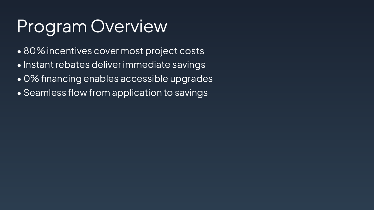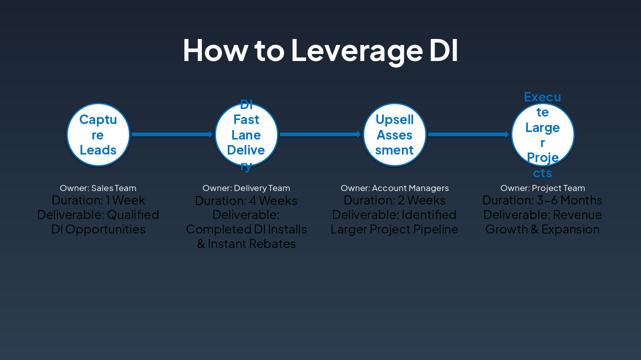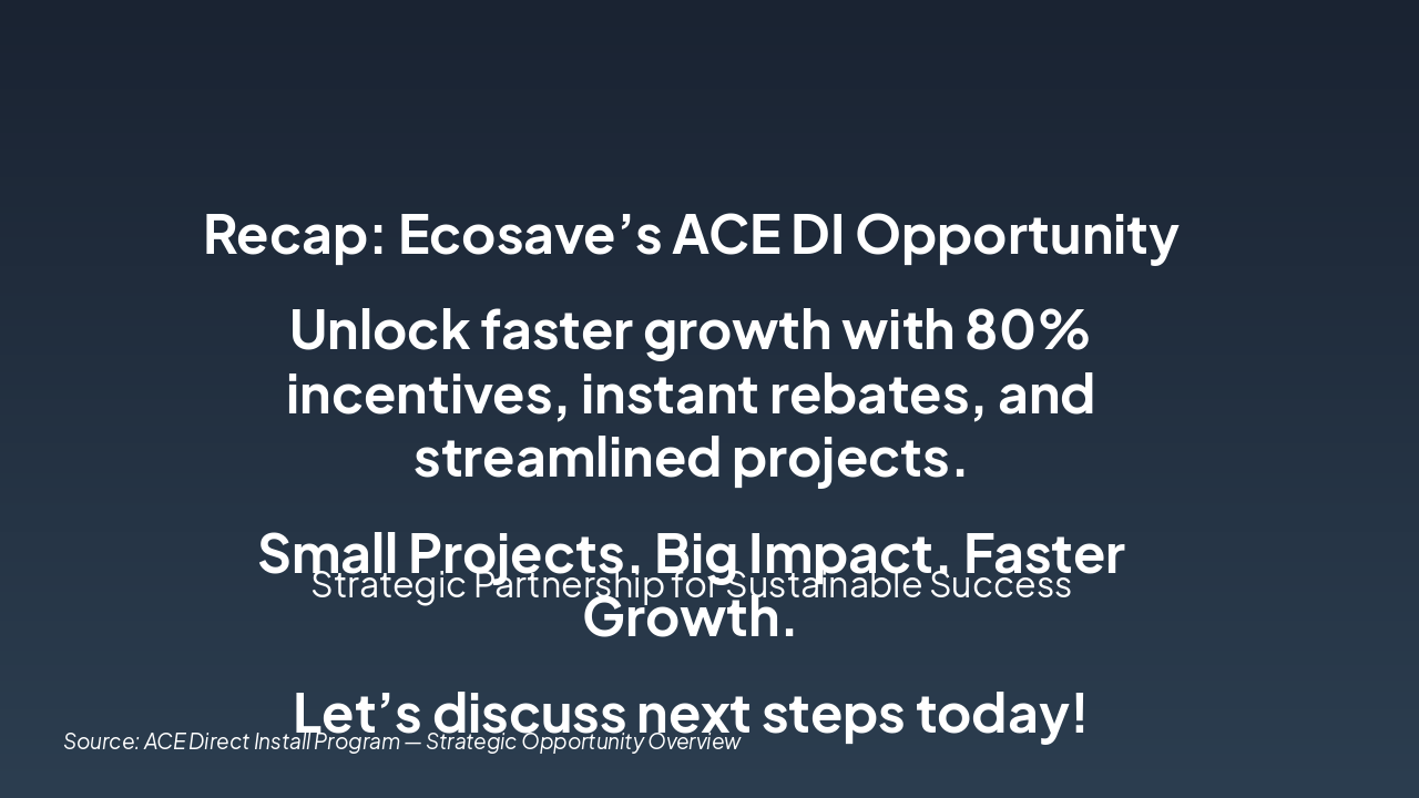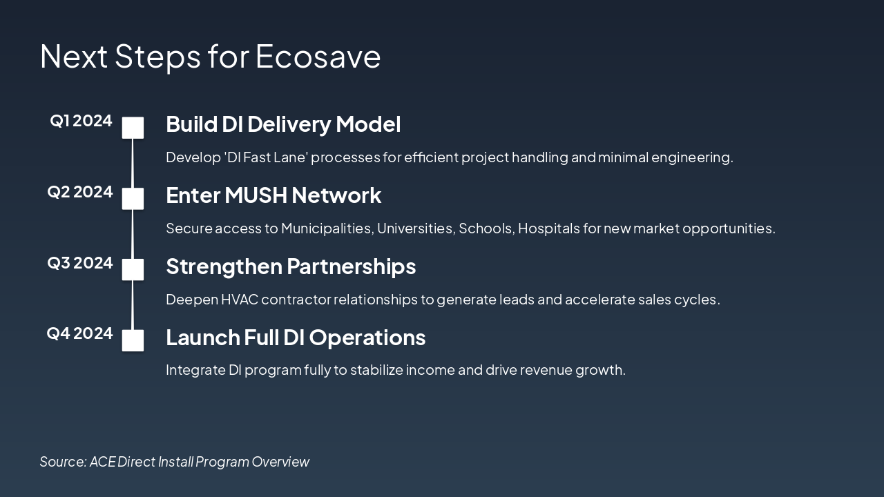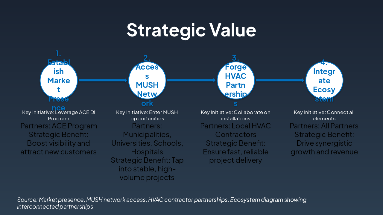 { "headers": [ "Step", "Key Initiative", "Partners", "Strategic Benefit" ], "rows": [ [ "1. Establish Market Presence", "Leverage ACE DI Program", "ACE Program", "Boost visibility and attract new customers" ], [ "2. Access MUSH Network", "Enter MUSH opportunities", "Municipalities, Universities, Schools, Hospitals", "Tap into stable, high-volume projects" ], [ "3. Forge HVAC Partnerships", "Collaborate on installations", "Local HVAC Contractors", "Ensure fast, reliable project delivery" ], [ "4. Integrate Ecosystem", "Connect all elements", "All Partners", "Drive synergistic growth and revenue" ] ] }