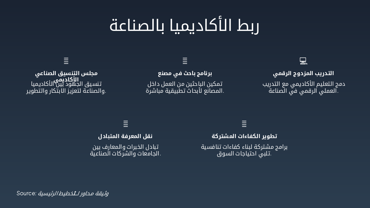 { "features": [ { "icon": "🤝", "heading": "مجلس التنسيق الصناعي الأكاديمي", "description": "تنسيق الجهود بين الأكاديميا والصناعة لتعزيز الابتكار والتطوير." }, { "icon": "🔬", "heading": "برنامج باحث في مصنع", "description": "تمكين الباحثين من العمل داخل المصانع لأبحاث تطبيقية مباشرة." }, { "icon": "💻", "heading": "التدريب المزدوج الرقمي", "description": "دمج التعليم الأكاديمي مع التدريب العملي الرقمي في الصناعة." }, { "icon": "🎯", "heading": "نقل المعرفة المتبادل", "description": "تبادل الخبرات والمعارف بين الجامعات والشركات الصناعية." }, { "icon": "🚀", "heading": "تطوير الكفاءات المشتركة", "description": "برامج مشتركة لبناء كفاءات تنافسية تلبي احتياجات السوق." } ] }