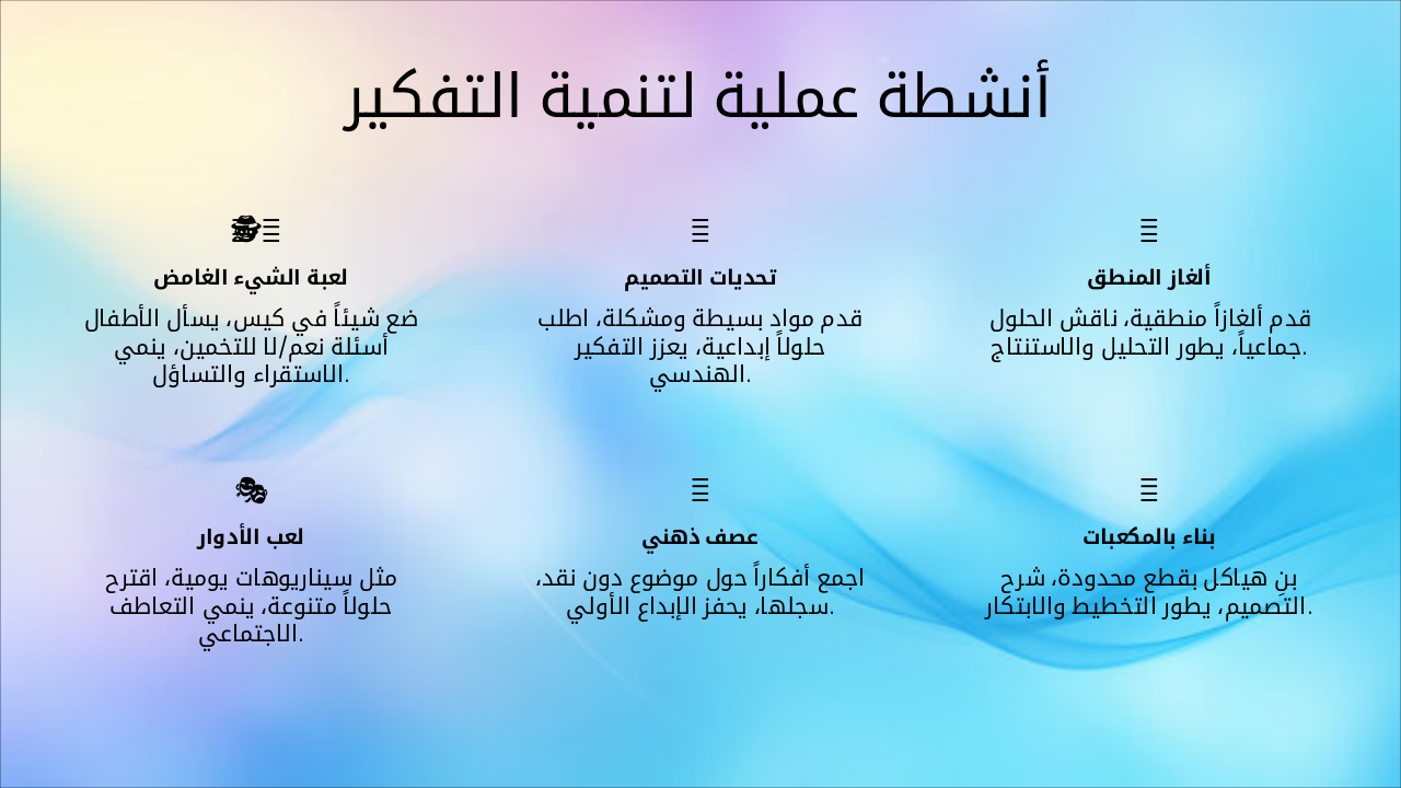 { "features": [ { "icon": "🕵️♂️", "heading": "لعبة الشيء الغامض", "description": "ضع شيئاً في كيس، يسأل الأطفال أسئلة نعم/لا للتخمين، ينمي الاستقراء والتساؤل." }, { "icon": "🔨", "heading": "تحديات التصميم", "description": "قدم مواد بسيطة ومشكلة، اطلب حلولاً إبداعية، يعزز التفكير الهندسي." }, { "icon": "🧠", "heading": "ألغاز المنطق", "description": "قدم ألغازاً منطقية، ناقش الحلول جماعياً، يطور التحليل والاستنتاج." }, { "icon": "🎭", "heading": "لعب الأدوار", "description": "مثل سيناريوهات يومية، اقترح حلولاً متنوعة، ينمي التعاطف الاجتماعي." }, { "icon": "💡", "heading": "عصف ذهني", "description": "اجمع أفكاراً حول موضوع دون نقد، سجلها، يحفز الإبداع الأولي." }, { "icon": "🧩", "heading": "بناء بالمكعبات", "description": "بنِ هياكل بقطع محدودة، شرح التصميم، يطور التخطيط والابتكار." } ] }