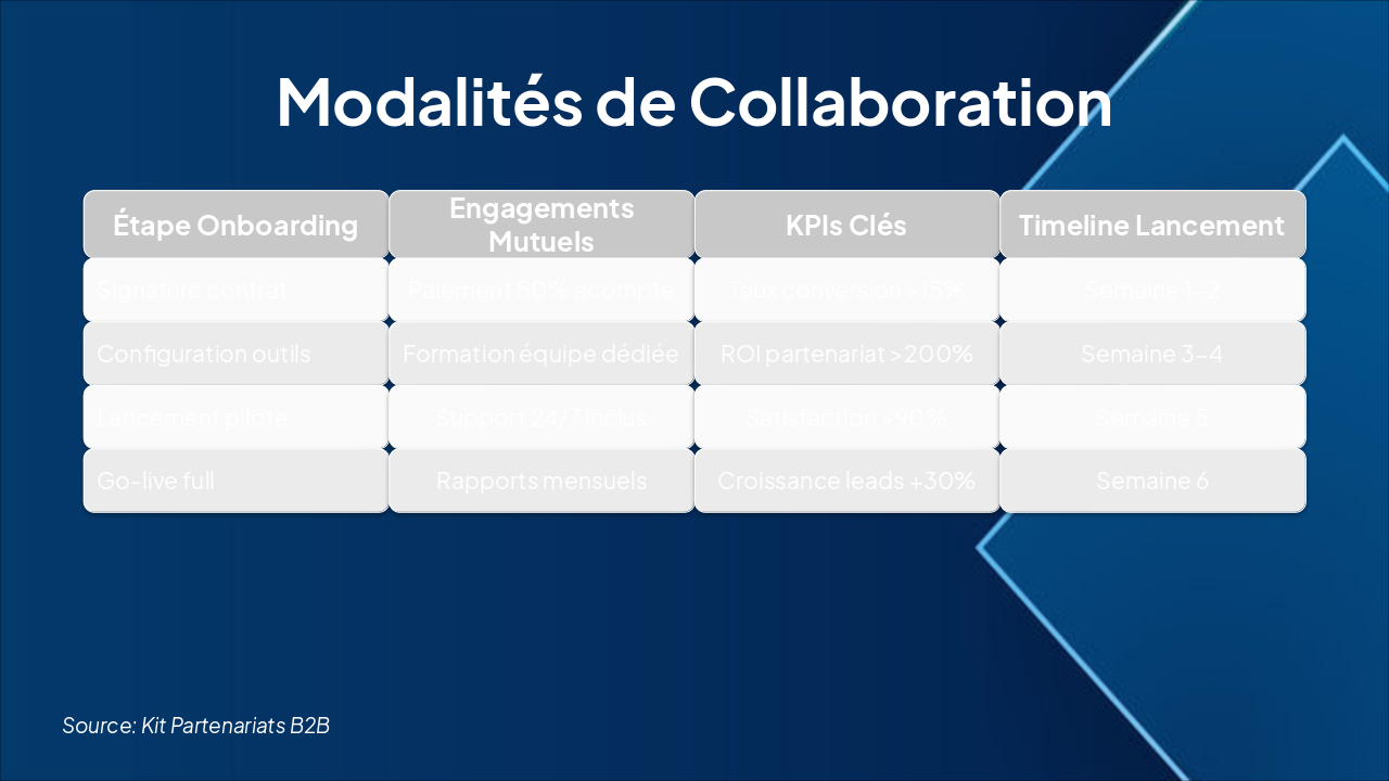 Cette diapositive de titre porte sur les "Partenariats B2B : Offre Irrésistible". Elle présente un kit conçu pour des collaborations gagnantes et mutuellement bénéfiques.