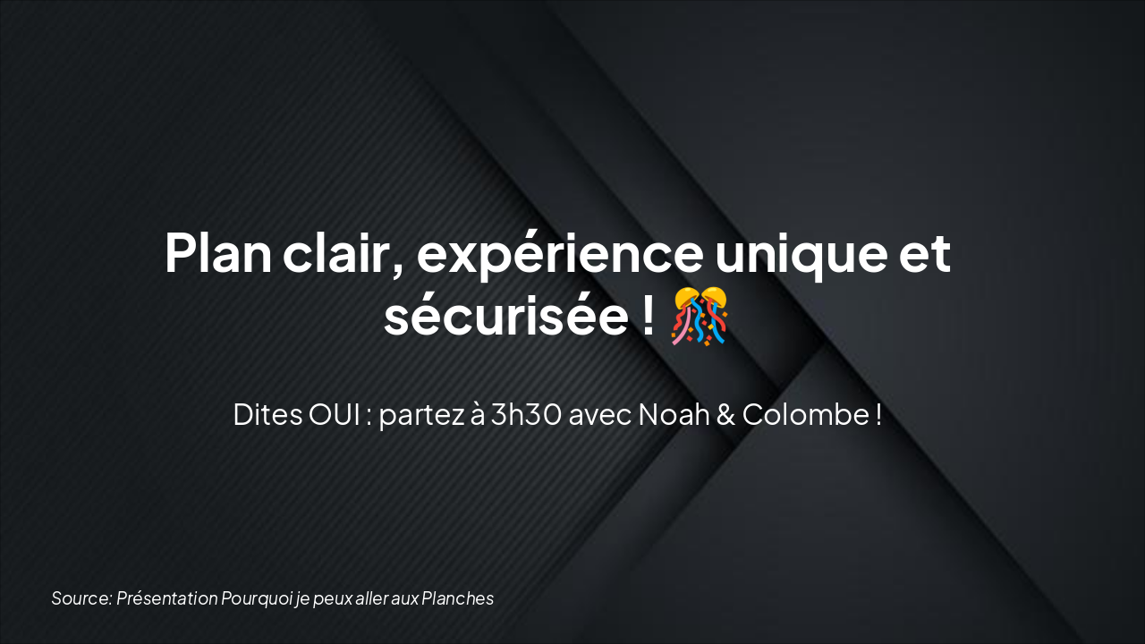 Ce slide de titre s'intitule « Pourquoi je peux aller aux Planches ». Son sous-titre annonce une « Présentation fun pour une soirée légendaire ! 🎉✨ ».