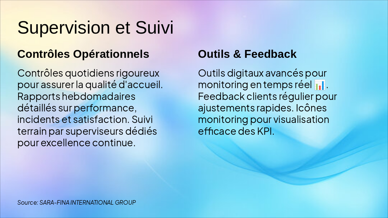 J1: Analyse des Besoins Évaluation approfondie des exigences en personnel d'accueil pour adapter notre solution. Semaine 1: Recrutement du Personnel Sélection rigoureuse des candidats qualifiés et motivés pour vos besoins spécifiques. Mois 1: Formation et Déploiement Programme de formation sur mesure suivi d'un déploiement immédiat et efficace. Continu: Suivi des Performances Monitoring régulier, feedback et ajustements pour une excellence opérationnelle durable.