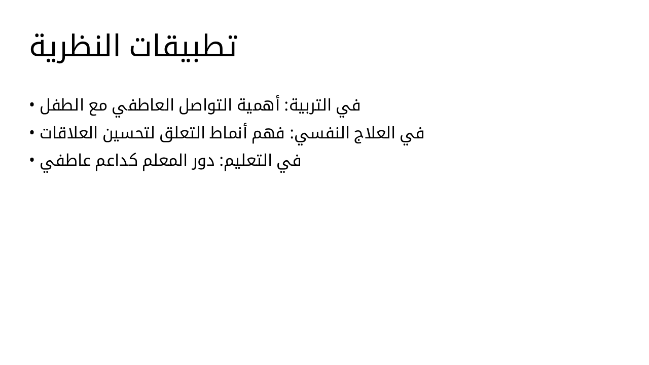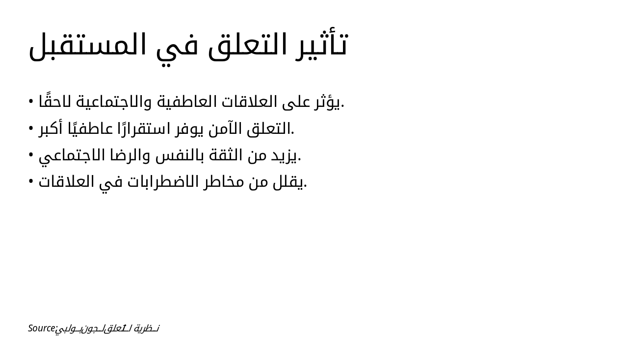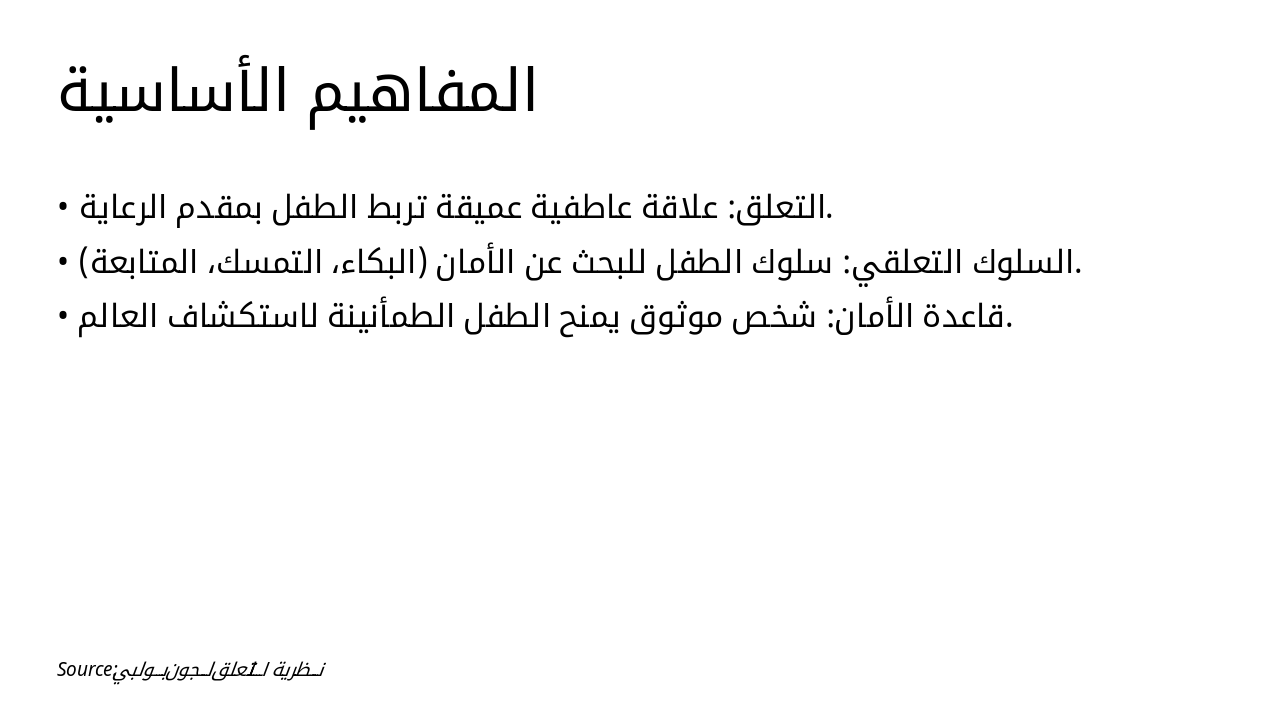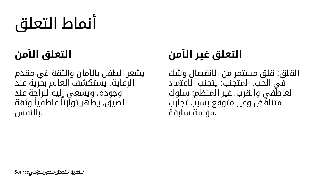 | يشعر الطفل بالأمان والثقة في مقدم الرعاية. يستكشف العالم بحرية عند وجوده، ويسعى إليه للراحة عند الضيق. يظهر توازناً عاطفياً وثقة بالنفس. | القلق: قلق مستمر من الانفصال وشك في الحب. المتجنب: يتجنب الاعتماد العاطفي والقرب. غير المنظم: سلوك متناقض وغير متوقع بسبب تجارب مؤلمة سابقة. |