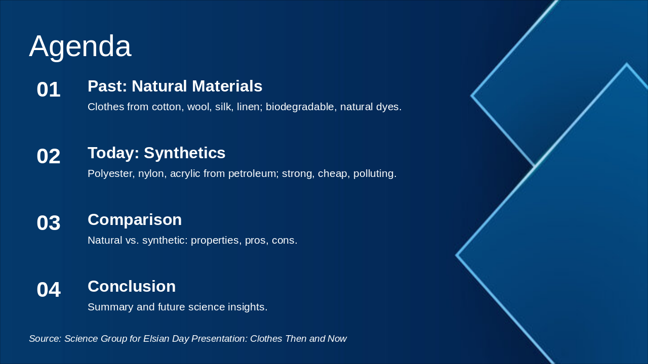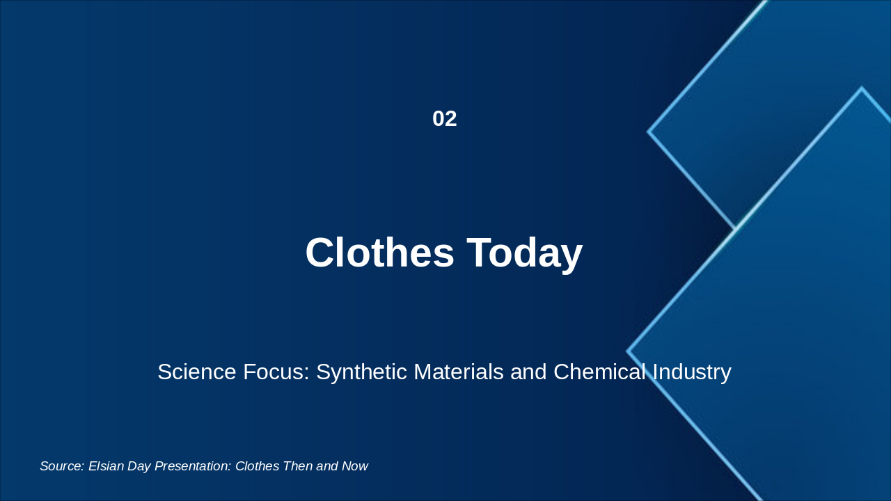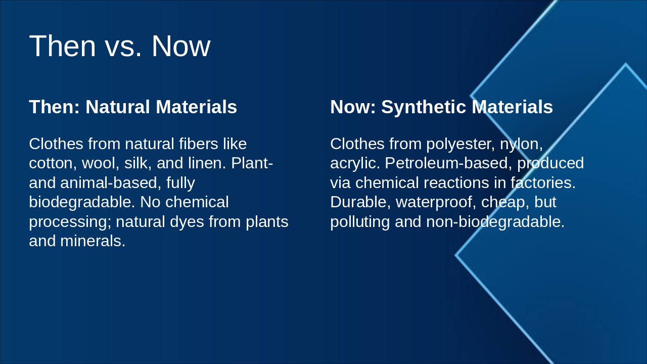 Science Group for Elsian Day Presentation: Clothes Then and Now (Professional Modern Science Theme) Style: Gradient blue background with clean professional layout and modern typography. Slide 1: Clothes in the Past Science Focus: Natural Materials - People used clothes made from natural fibers like cotton, wool, silk, and linen. - These materials came from plants and animals and were biodegradable. - No chemical processing; natural dyes from plants and minerals. Slide 2: Clothes Today Science Focus: Synthetic Materials & Chemical Industry - Many clothes are made from synthetic fibers such as polyester, nylon, and acrylic. - Made in factories from petroleum using chemical reactions. - Strong, waterproof, and cheap but not environmentally friendly.