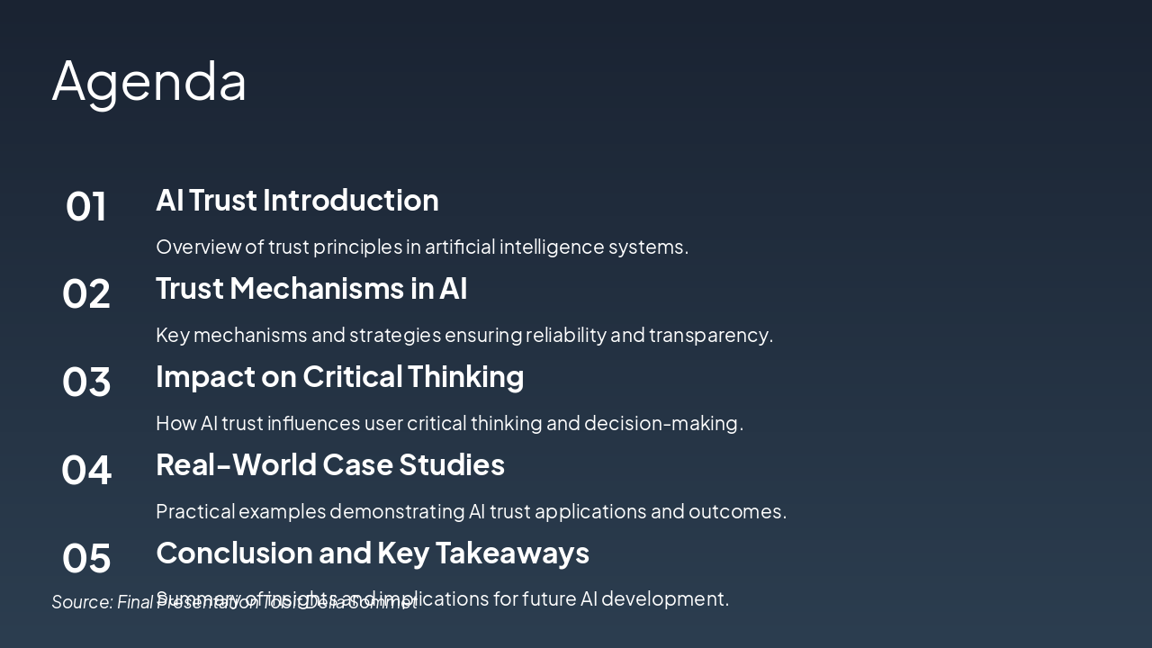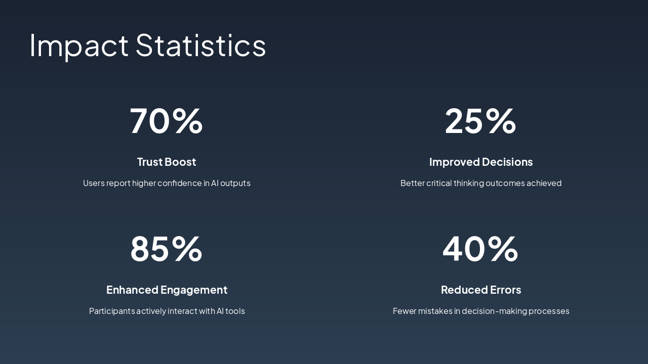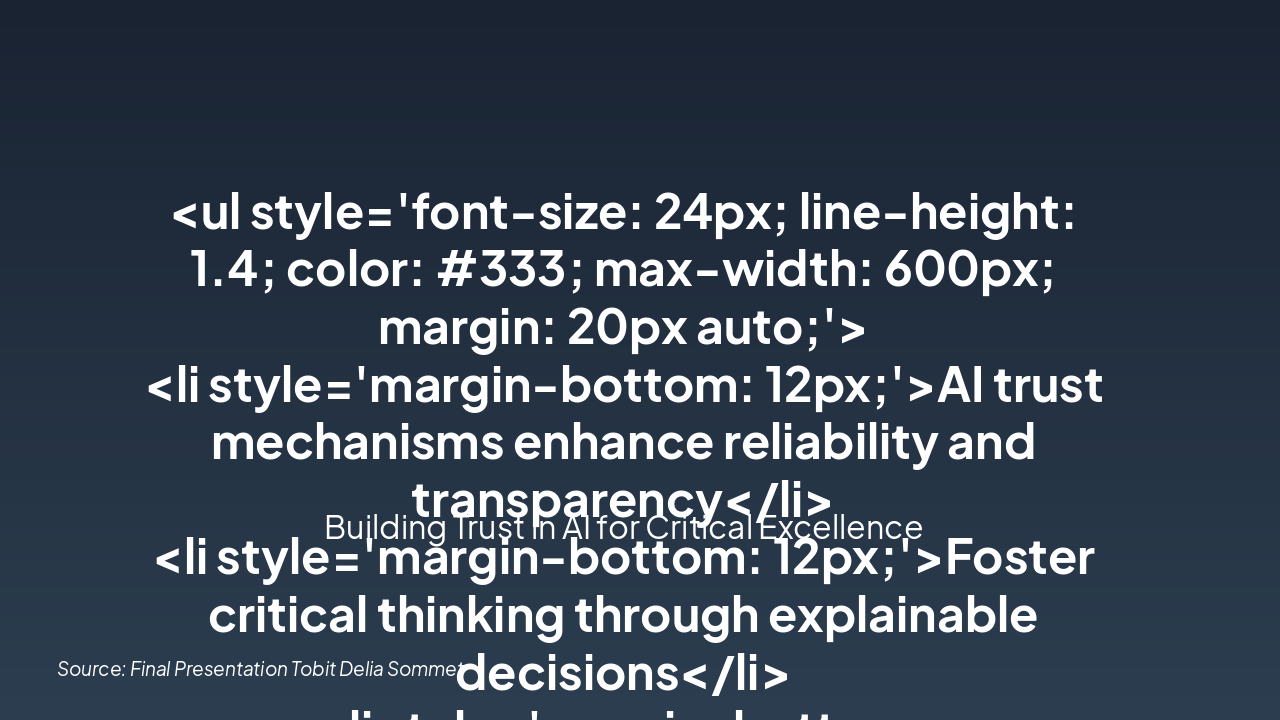 <ul style='font-size: 24px; line-height: 1.4; color: #333; max-width: 600px; margin: 20px auto;'> <li style='margin-bottom: 12px;'>AI trust mechanisms enhance reliability and transparency</li> <li style='margin-bottom: 12px;'>Foster critical thinking through explainable decisions</li> <li style='margin-bottom: 12px;'>Implement balanced oversight for ethical AI use</li> </ul> <div style='text-align: center; margin: 30px 0;'> <h2 style='font-size: 28px; color: #f39c12; margin-bottom: 10px;'>Secure the Future of AI</h2> <p style='font-size: 20px; color: #666; margin-bottom: 20px;'>Adopt these strategies today to build trust and empower critical thinking.</p> <button style='background: linear-gradient(135deg, #f39c12, #e67e22); color: white; padding: 15px 40px; font-size: 20px; border: none; border-radius: 50px; cursor: pointer; box-shadow: 0 8px 20px rgba(243, 156, 18, 0.3); animation: pulse 2s infinite;'>Get Started Now</button> </div> <style> @keyframes fadeOut { 0% { opacity: 1; transform: translateY(0); } 100% { opacity: 0; transform: translateY(20px); } } #slide-content { animation: fadeOut 0.8s ease-out 2s forwards; } @keyframes pulse { 0%, 100% { box-shadow: 0 8px 20px rgba(243, 156, 18, 0.3); } 50% { box-shadow: 0 8px 30px rgba(243, 156, 18, 0.5); } } </style>