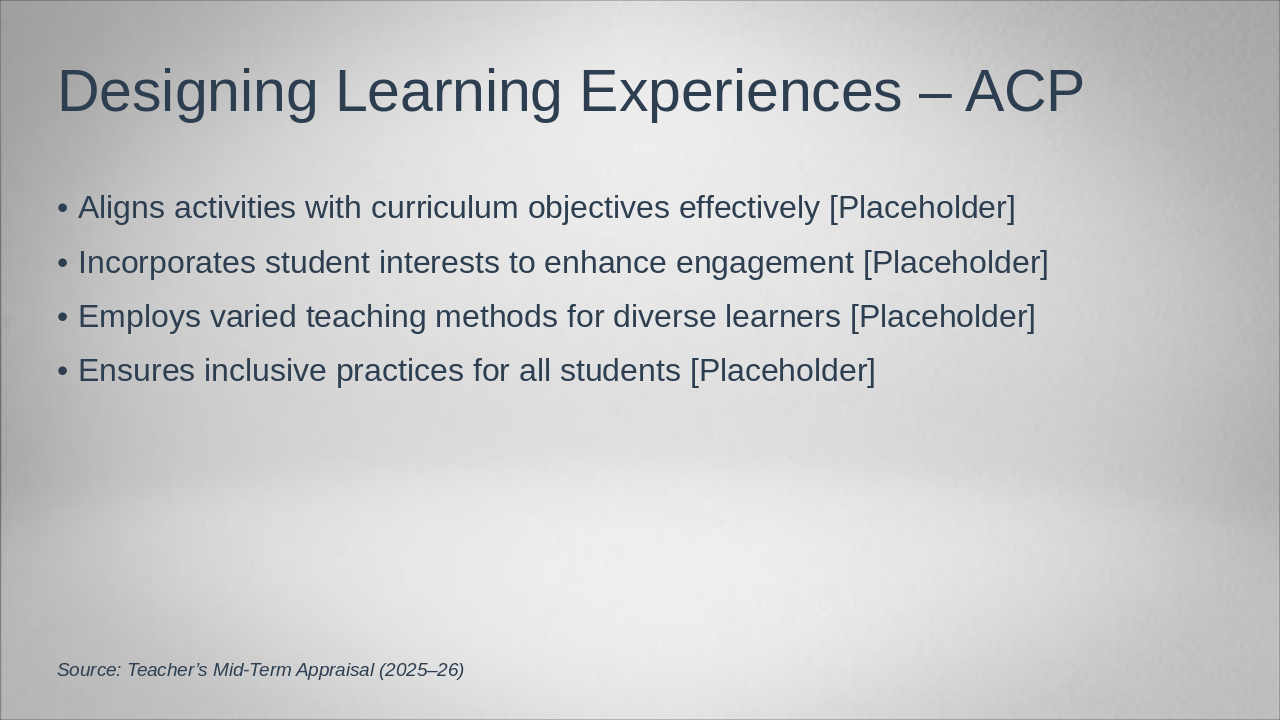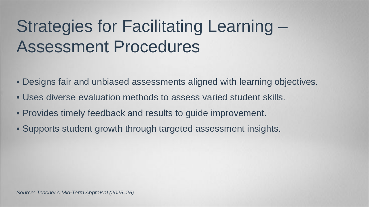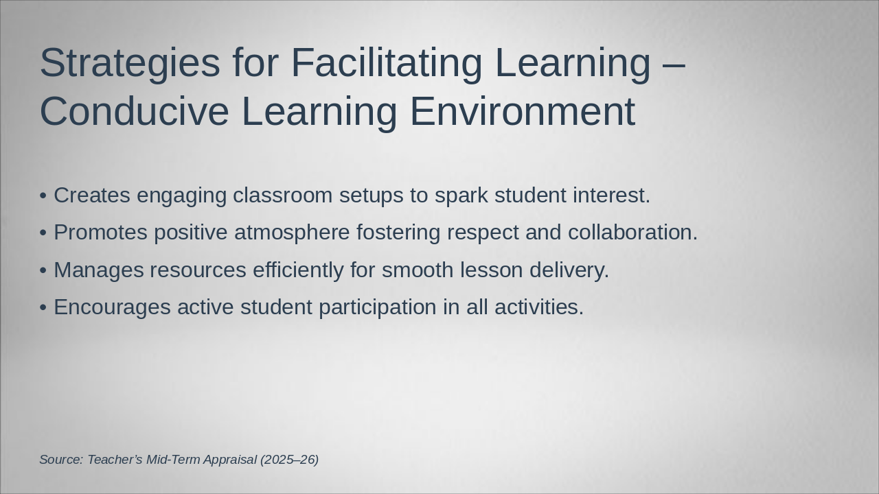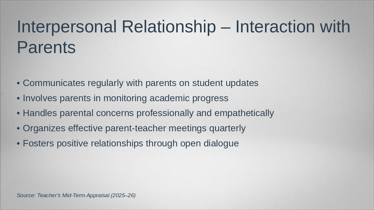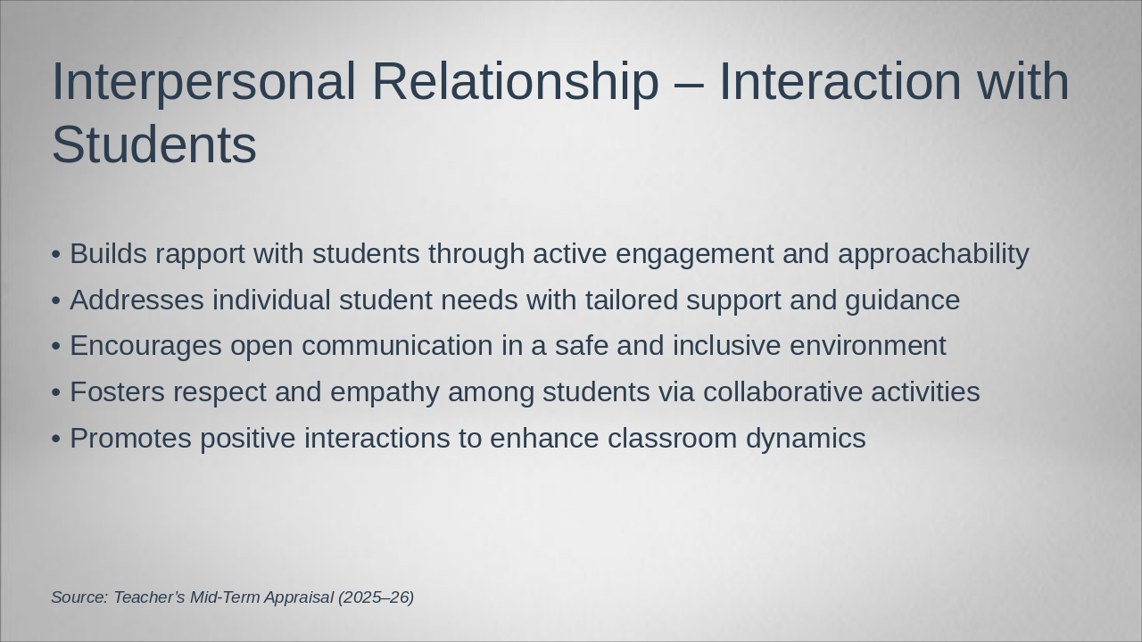 Engages in training, innovations, punctuality, and school initiatives. Source: Teacher’s Mid-Term Appraisal (2025–26)