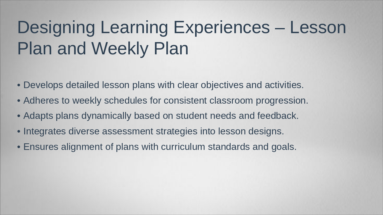 The agenda slide outlines key competencies for educators, starting with "Knowledge and Understanding," which emphasizes deep subject expertise and effective pedagogical skills. It continues with "Designing Learning Experiences" for curriculum-aligned lesson planning, "Strategies for Facilitating Learning" involving environments and assessments, "Interpersonal Relationships" for positive interactions, and "Professional and School Development" focusing on training and initiatives.