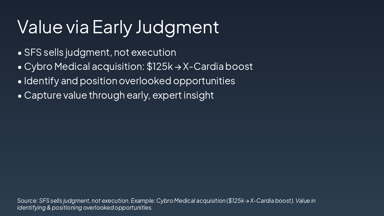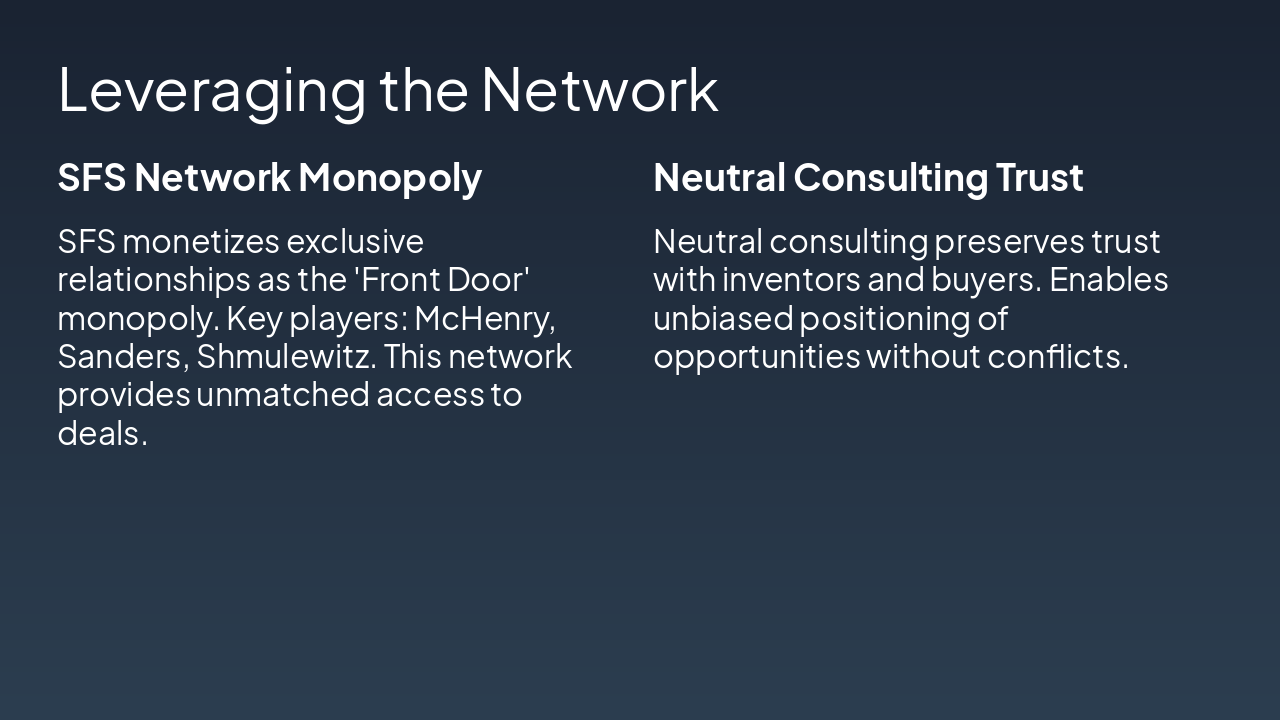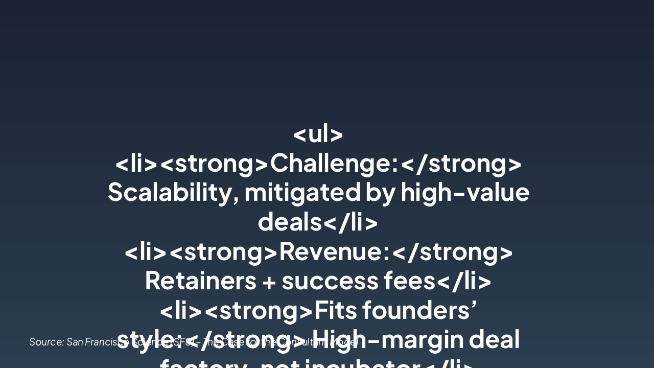 <ul> <li><strong>Challenge:</strong> Scalability, mitigated by high-value deals</li> <li><strong>Revenue:</strong> Retainers + success fees</li> <li><strong>Fits founders’ style:</strong> High-margin deal factory, not incubator</li> </ul>