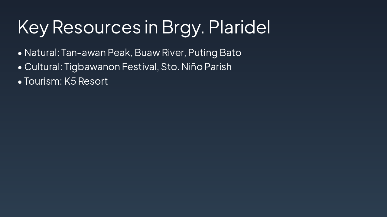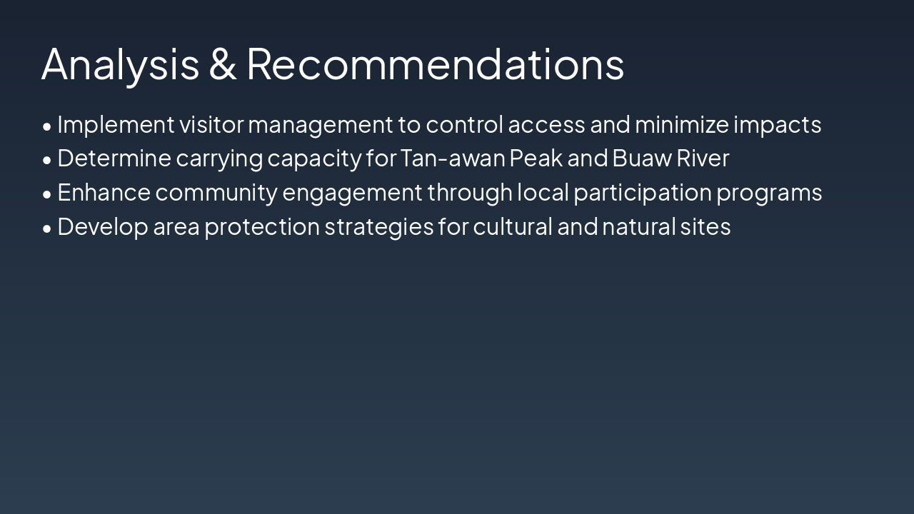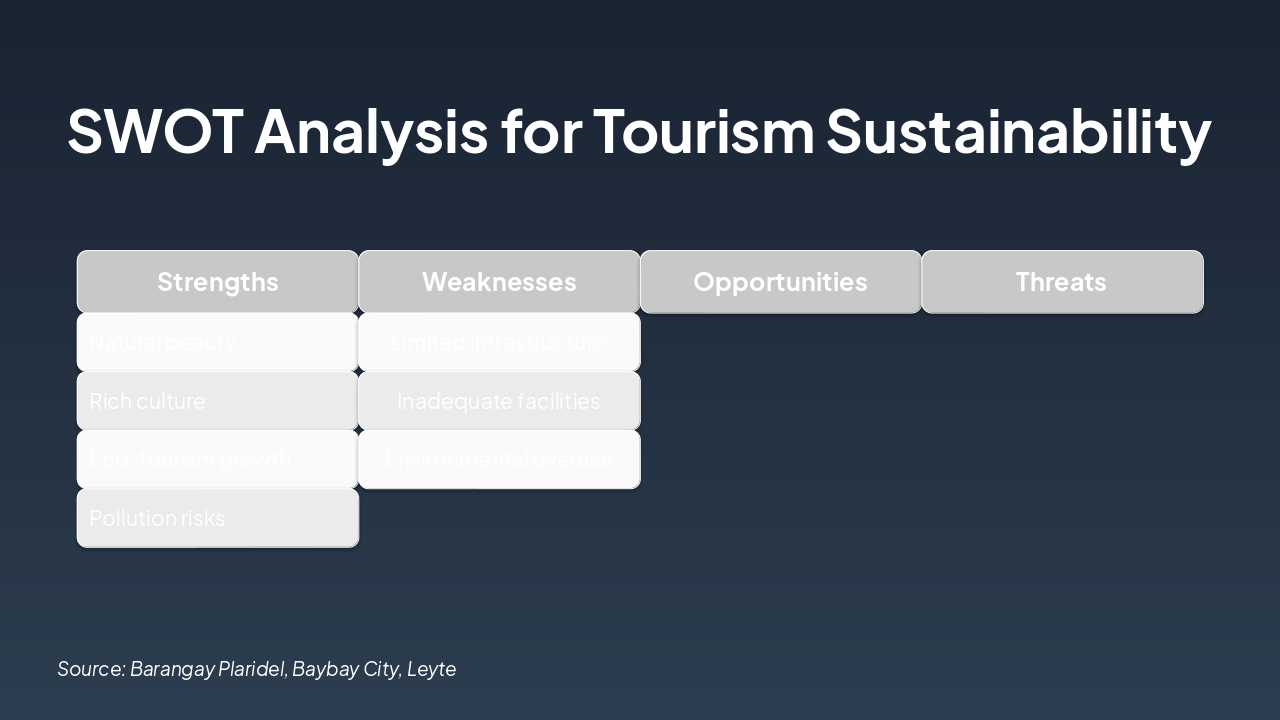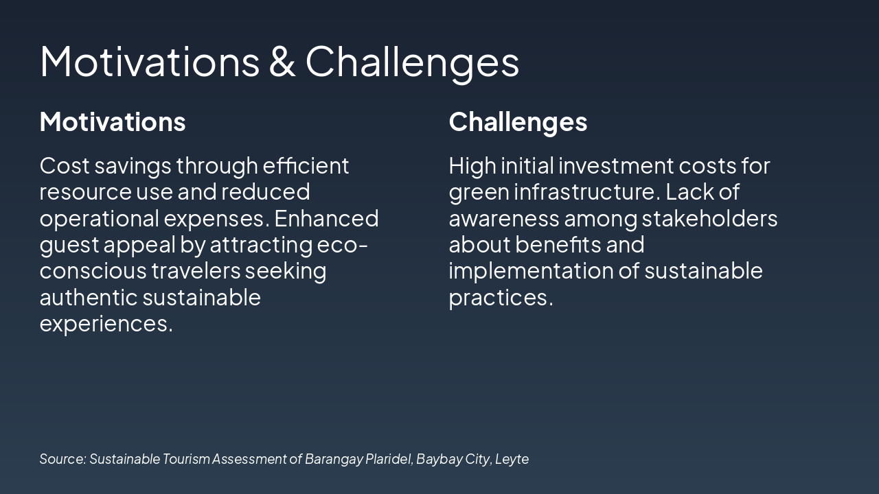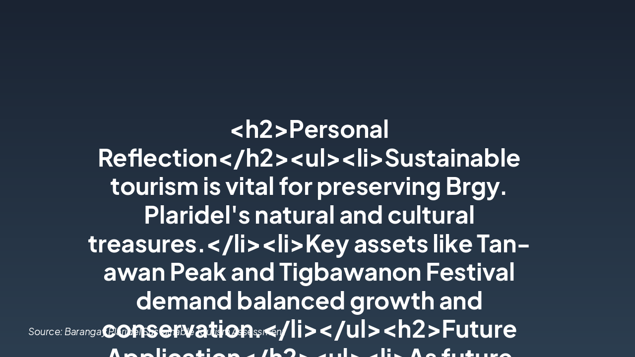 <h2>Personal Reflection</h2><ul><li>Sustainable tourism is vital for preserving Brgy. Plaridel's natural and cultural treasures.</li><li>Key assets like Tan-awan Peak and Tigbawanon Festival demand balanced growth and conservation.</li></ul><h2>Future Application</h2><ul><li>As future tourism professionals, promote green practices at resorts like K5.</li><li>Advocate visitor management, community engagement, and protected carrying capacity.</li></ul><p><strong>Closing: Preserve today for tomorrow's adventures.</strong></p><p><em>Call-to-Action: Commit to sustainability in every tourism initiative.</em></p>