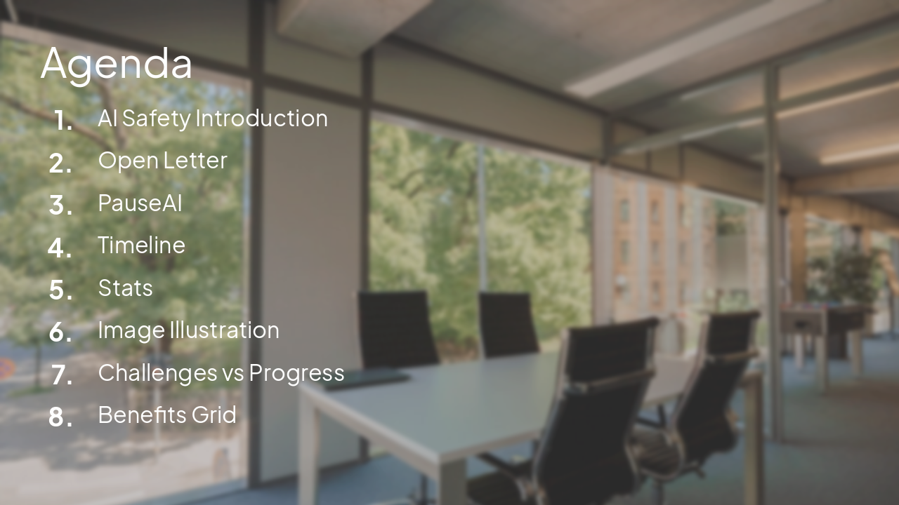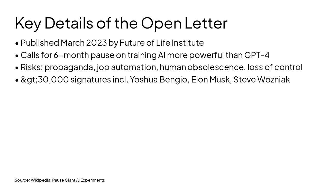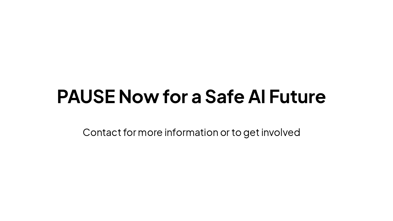 Mar 2023: Open Letter Published Future of Life Institute calls for 6-month pause on giant AI experiments May 2023: PauseAI Founded Established in Utrecht, Netherlands by Joep Meindertsma 2023: AI Safety Summit US & UK launch AI Safety Institutes amid rising concerns