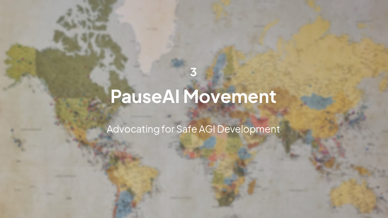 March 2023: Open Letter Call to pause giant AI experiments May 2023: PauseAI Launch Movement founded in Netherlands 2023: AI Safety Summit US & UK AI Safety Institutes established