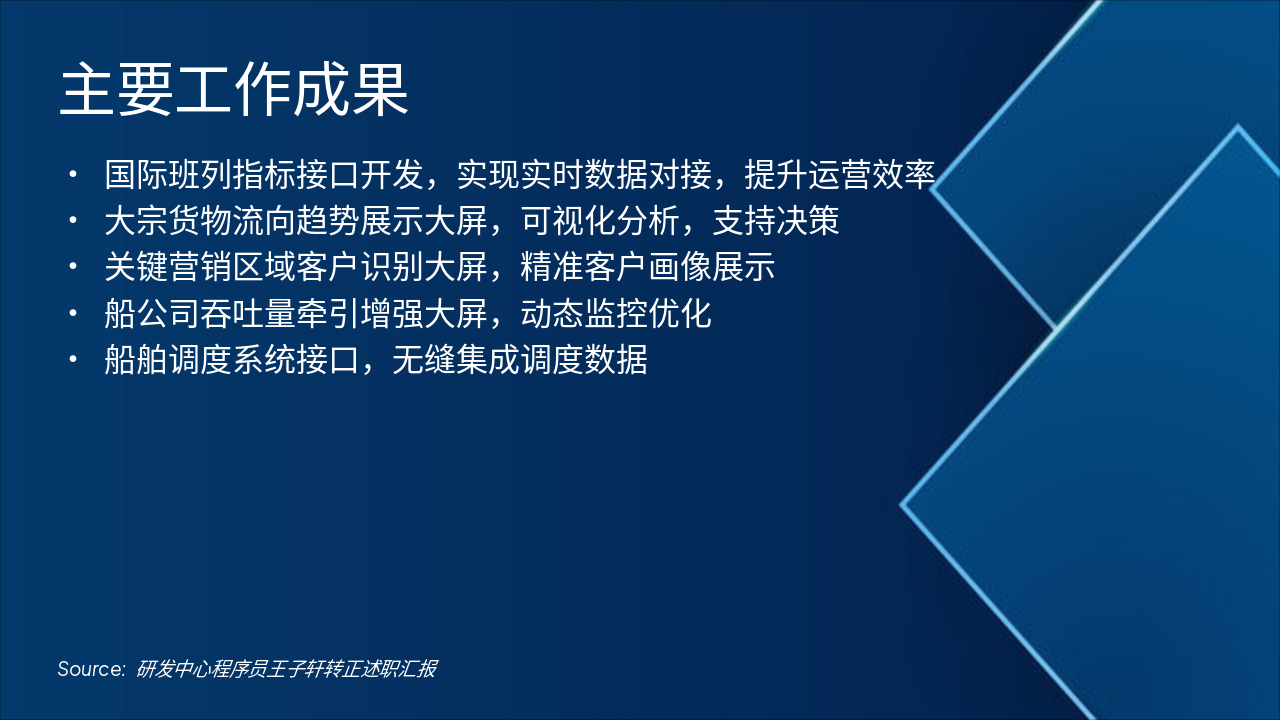 主要工作成果包括开发国际班列指标接口,实现实时数据对接并提升运营效率,以及船舶调度系统接口的无缝集成。 此外,还构建了大宗货物流向趋势展示大屏、关键营销区域客户识别大屏和船公司吞吐量牵引增强大屏,支持可视化分析、精准画像和动态监控优化。