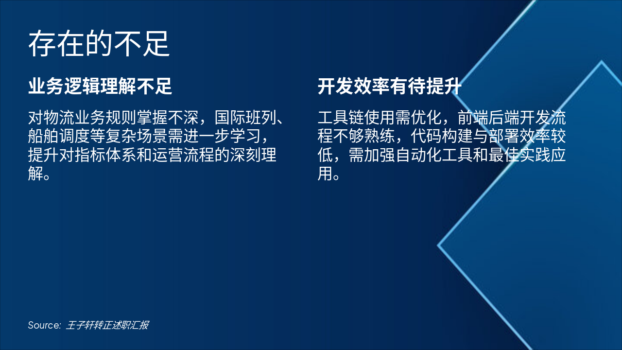 业务逻辑理解不足,对物流业务规则掌握不深,需进一步学习国际班列、船舶调度等复杂场景,提升对指标体系和运营流程的深刻理解。开发效率有待提升,工具链使用需优化,前后端开发流程不够熟练,代码构建与部署效率较低,应加强自动化工具和最佳实践应用。