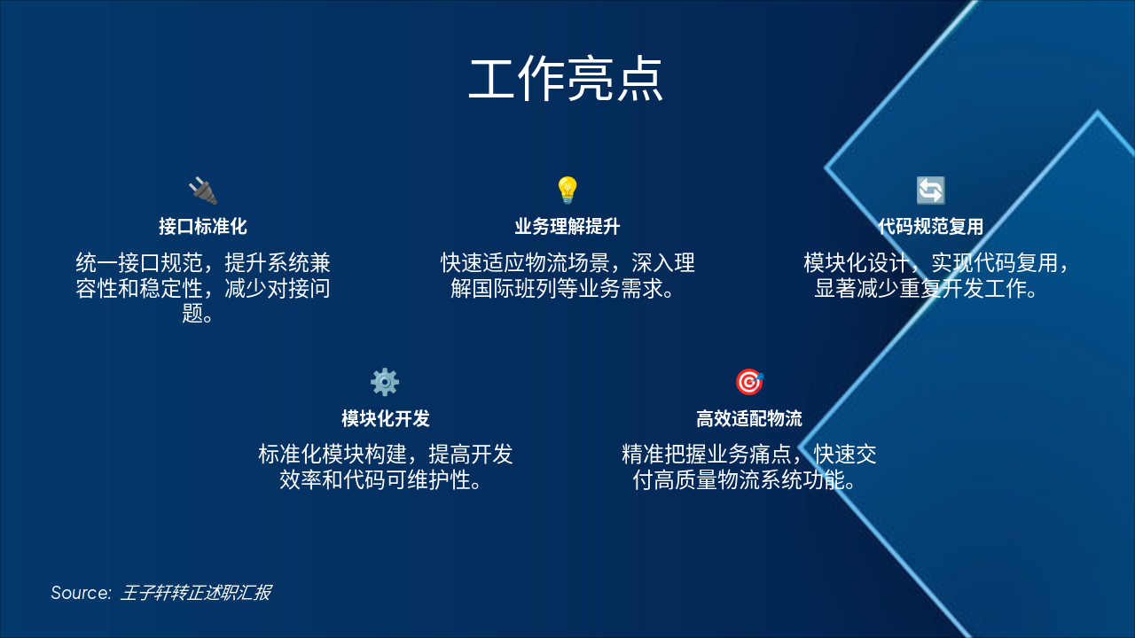 本滑片“工作亮点”展示了五个关键特征:接口标准化提升兼容性、业务理解提升适应物流场景、代码规范复用减少重复开发、模块化开发提高效率,以及高效适配物流精准解决痛点。 这些亮点通过统一规范、模块化设计和深入业务理解,显著提升了系统稳定性和开发效率。